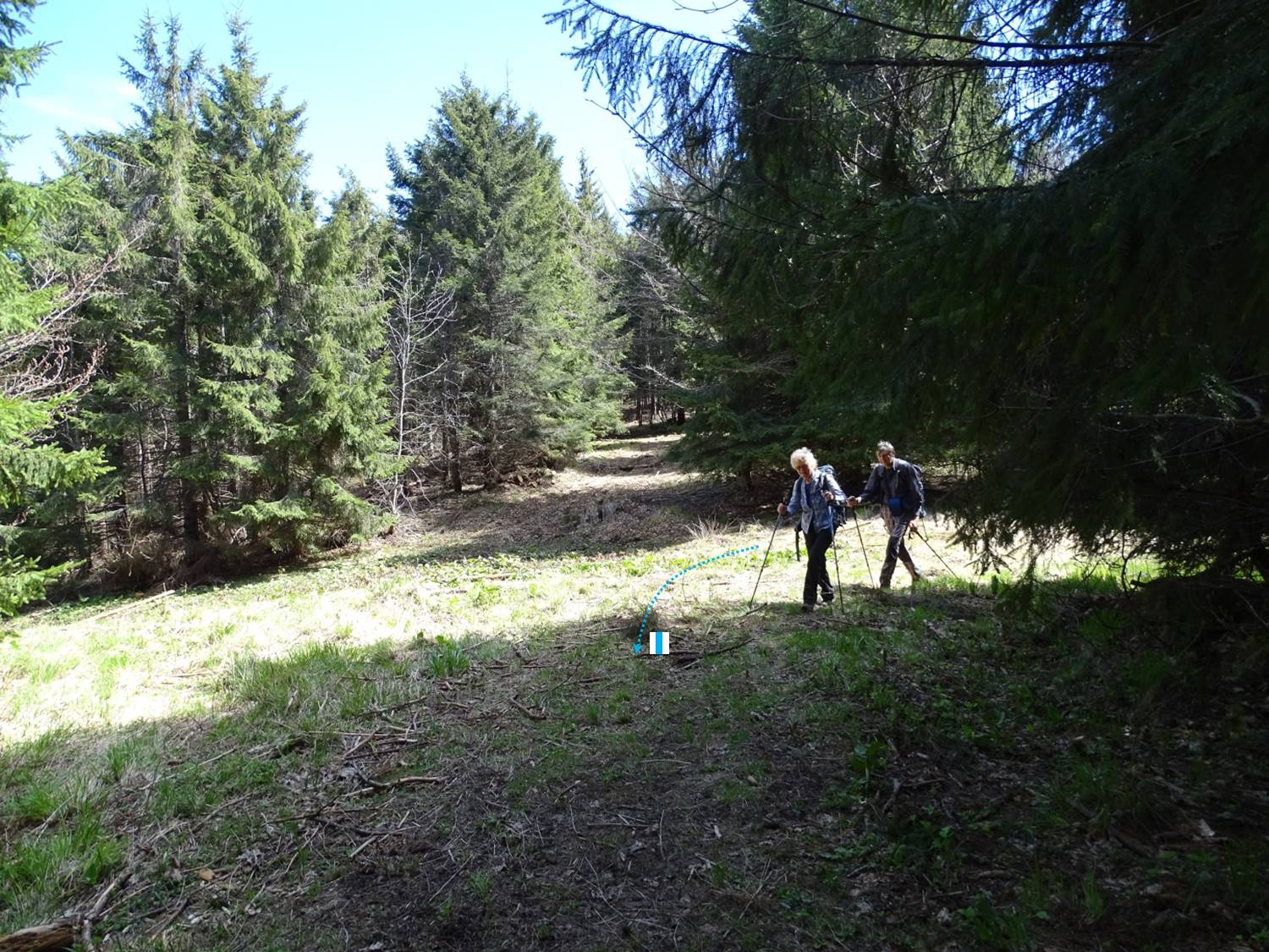 … și iar pădure; întâlnim imediat marcajul culmii principale a Munților Harghita, venind din dreapta, în ocol al Vârfului Pajiștea Neagră !