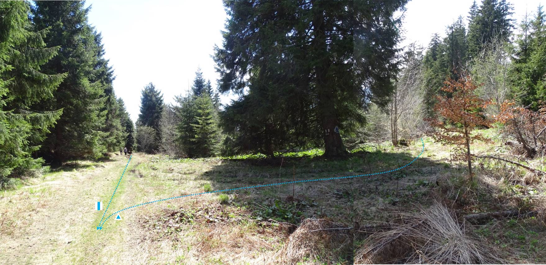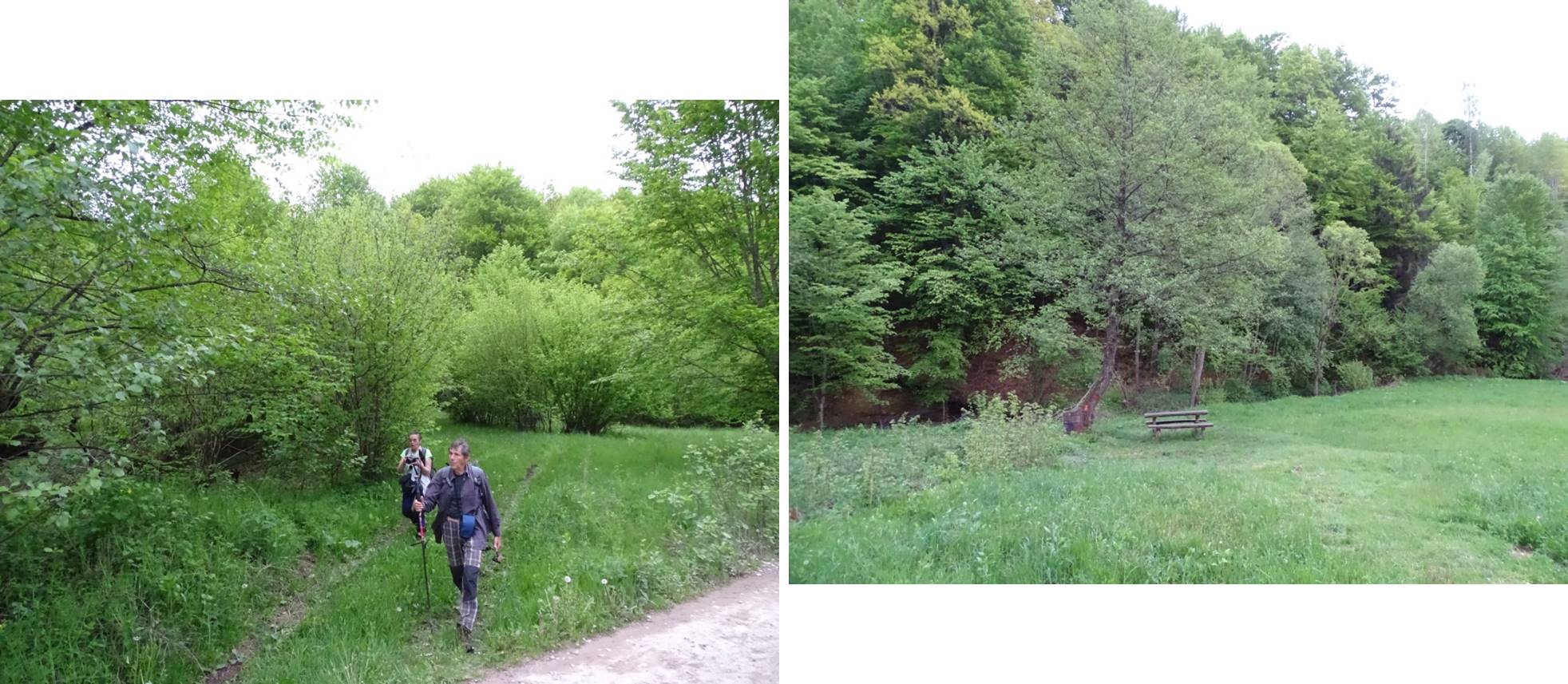 – să schimbăm direcția spre sud și, prin pădure, după cca 250 m, să ajungem în marginea unei poieni, lângă un izvor amenajat, …