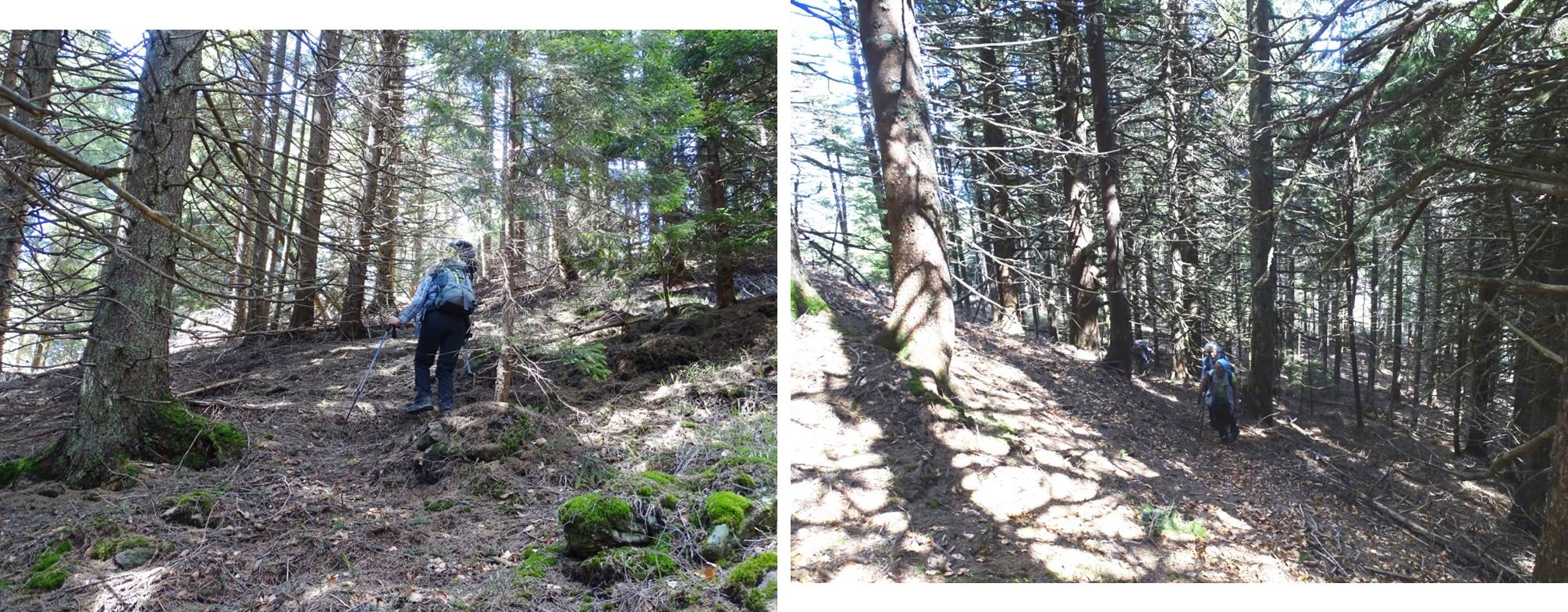 … descurcându-ne, relativ la liber, pe o potecuță de animale ce se strecoară printr-o plantație de zadă și molid …