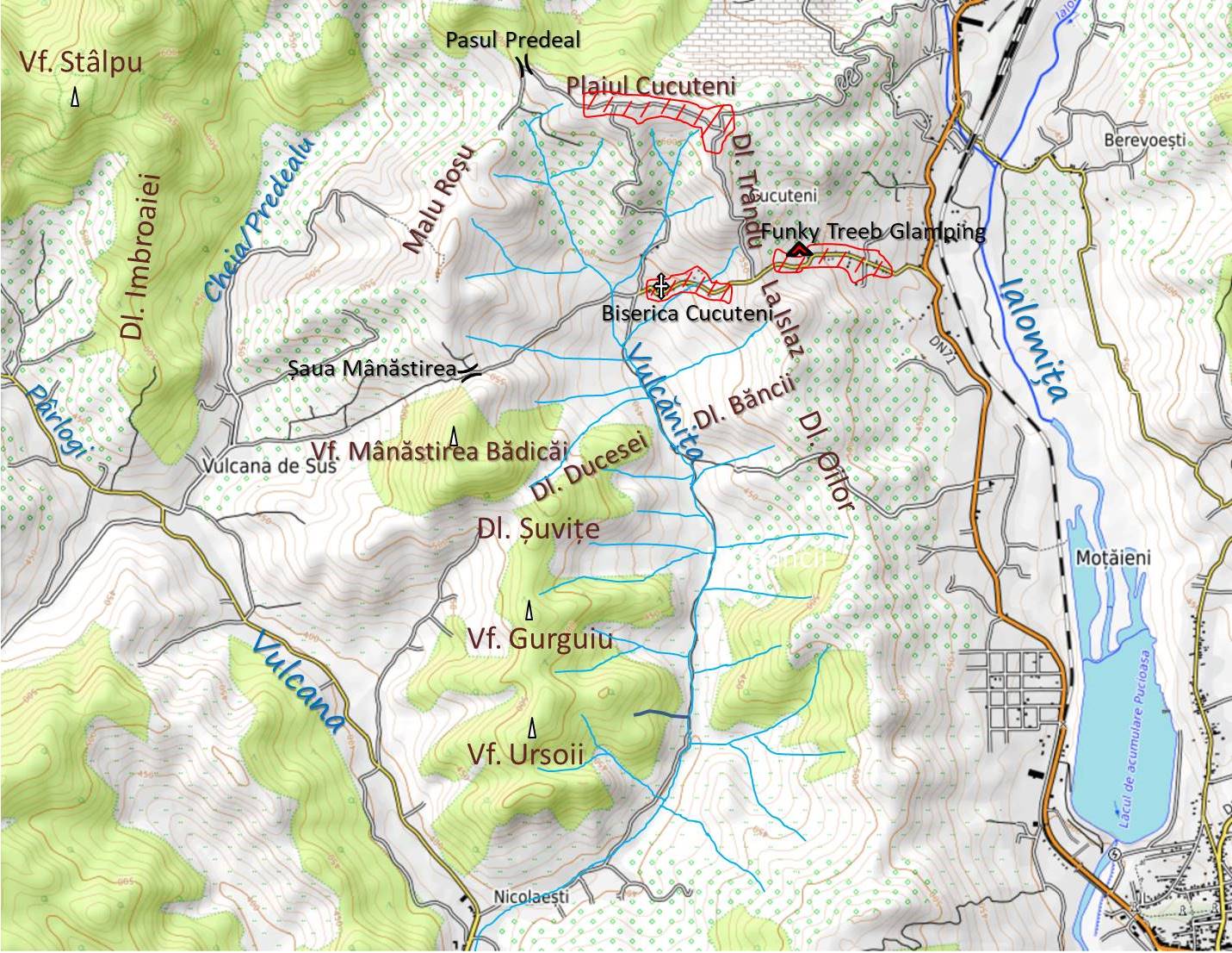 O drumeție anterioară în zona menționată în titlu (click aici pentru aces la fotoreportaj) ne-a atras atenția asupra diversității ei floristice, îndeosebi prin multele specii de orhidee pe care le-am întâlnit într-o simplă plimbare. Mai mult de atât, ulterior, două surse … independente ne-au atras atenția asupra faptului că în zonă creșsc și orhidee din genul Ophris (celebrele orhidee-albină); doar și atât a fost suficient să ne mobilizeze pentru a reveni în zonă ! Dar, ca și la prima miniexpediție, am înscris interesul floristic în cercul mai larg al celui pur turistic, așa că am adăugat plimbării de pe dealurile Cucutenilor – prin pajiștile cărora ni s-a spus că ar crește orhidee-albină – o minidrumeție la două obiective care ne atrăseseră deja atenția: Complexul Ecumenic de la Vulcana-Băi și Schitul Bunea ! Demersul nostru, în ambele situații, ne-a fost facilitat de existența, la Cucuteni, a unui glamping – Funky Treeb – cu o ofertă excelentă privind cazarea (condiții și preț); ceea ce ne-a permis adaosuri de substanță: un traseu în Munții Leaota (aici, fotoreportajul) și unul în Munții Bucegi (o schiță a traseului, aici) ! Concret, acum:
