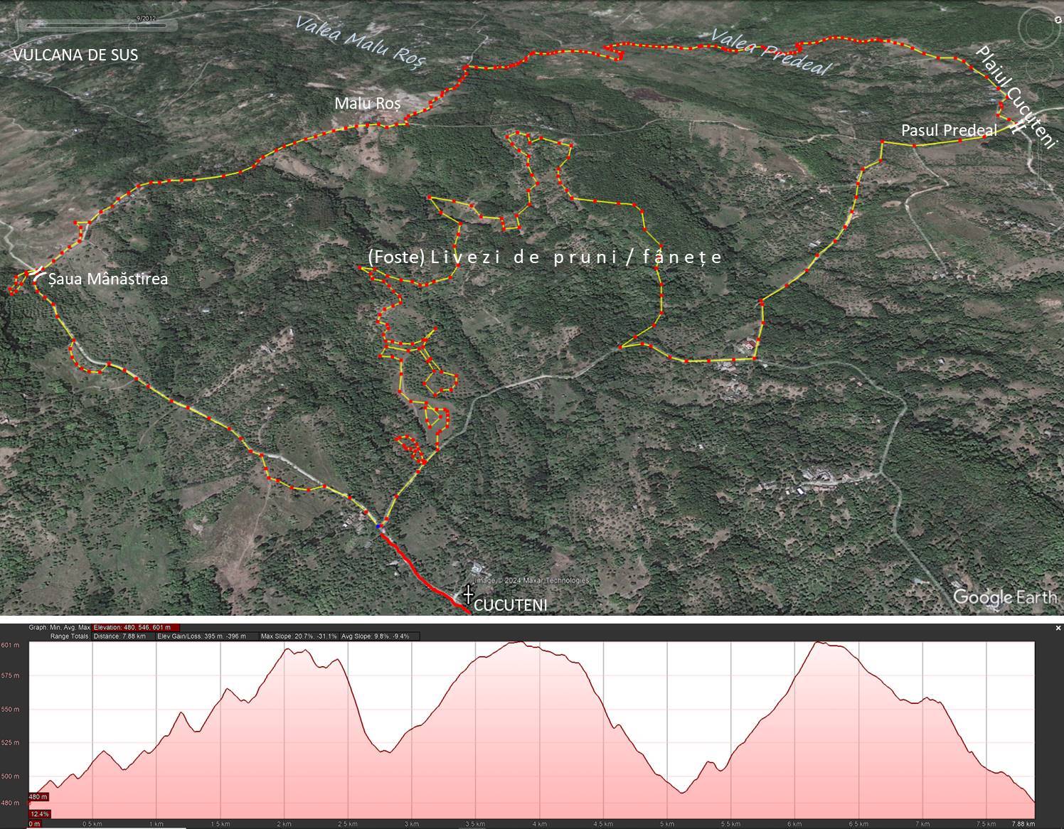 Traseul zilei 1 (17 mai 2024): CUCUTENI (1 km dincolo de biserică) – Prin (foste) livezi de pruni și fânețe – Pasul Predeal – Plaiul Cucutenilor – Valea Predealului – Malu Roșu – Șaua Mânăstirea – CUCUTENI