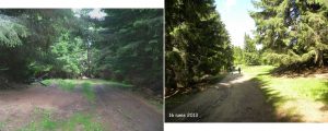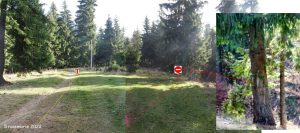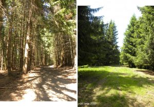 Drumul forestier, bine conturat, cotește imediat spre stânga, …