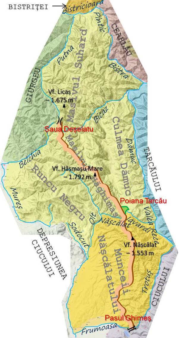 Din punct de vedere geomorfologic Munții Hășmaș pot fi … destructurați în trei sectoare: în nord, Masivul Suhard, central, Masivul Hăghimaș și Munceii Nășcălatului la sud (despre relația Munceii Nășcălatului-Munții Hășmaș se poate citi aici !). Din culmea lor principală descriem doar fragmentul ce-i leagă de Munții Ciucului – prin pasul Ghimeș – și de Munții Giurgeului – prin Șaua Deșelatu, parte a culmii principale numită “a Carpaților”.