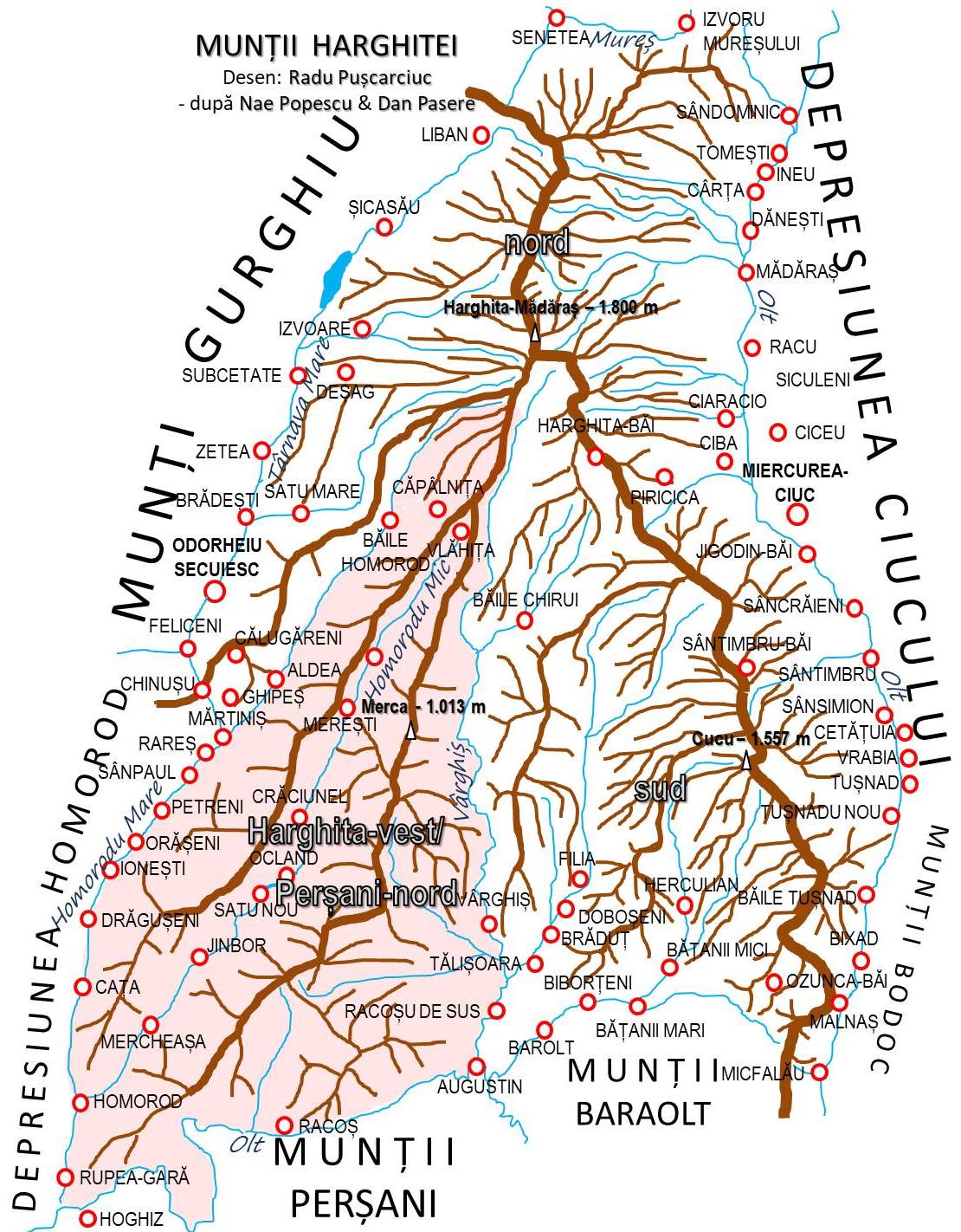 Delimitări precise între Munții Harghitei, Munții Perșani și structurile vecine găsim în monografiile turistice aferente celor două masive (a se vedea bibliografia). Decupând din cadrul Munților Harghitei ceea ce ar aparține – conform acestor delimitări – Perșanilor Nordici și privind cum arată culmile ce alcătuiesc noile structuri (Harghita-Vest și Perșani-Nord) credem că surprind (… neplăcut) cel puțin discontinuitățile lor morfologice; în condițiile în care regionarea pe care o discutăm este, în cele din urmă, doar o convenție.
