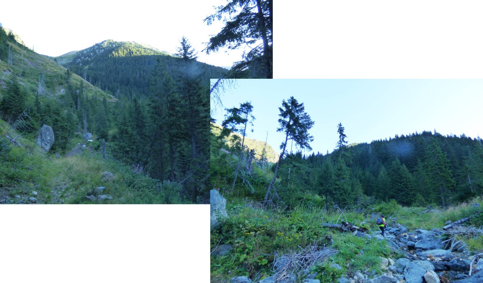 … de unde intrăm pentru scurt timp în pădure pentru a continua urcușul pe muchia Piciorului Slăninei/Budurului.