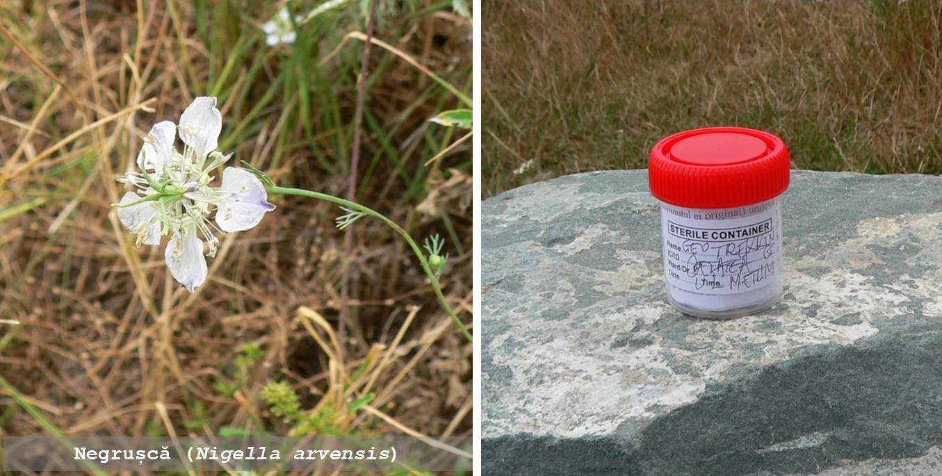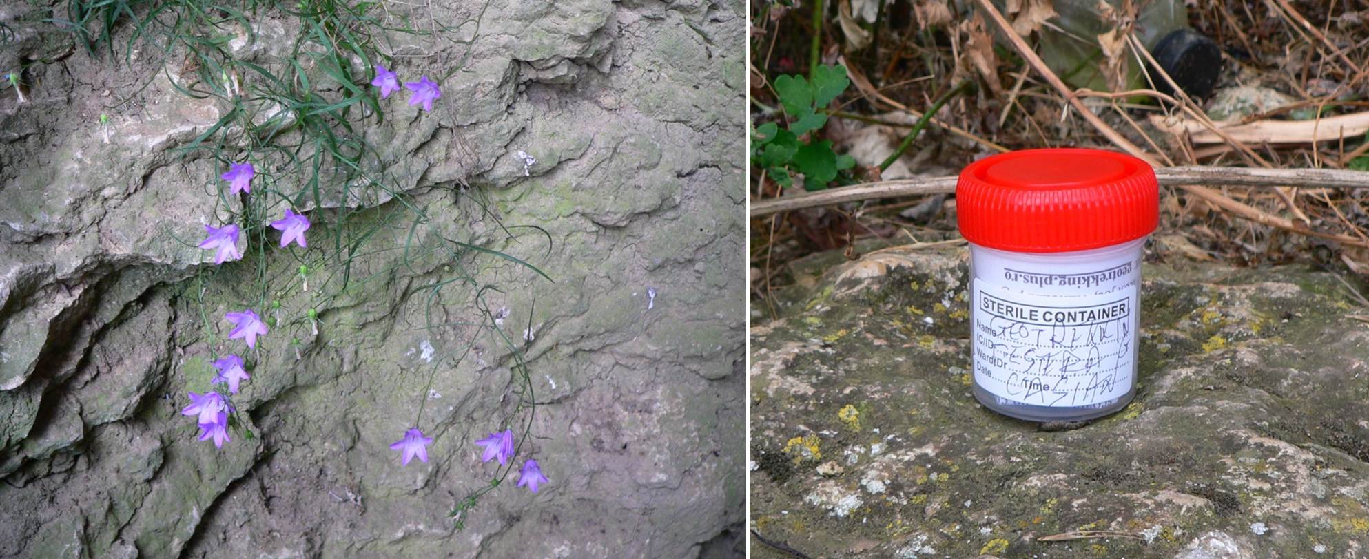 În fisurile pereților de calcar de sub intrarea în peșteră și-au făcut loc rădăcinile Campanulei romanica, un endemism dobrogean, dar și o … geocutie!