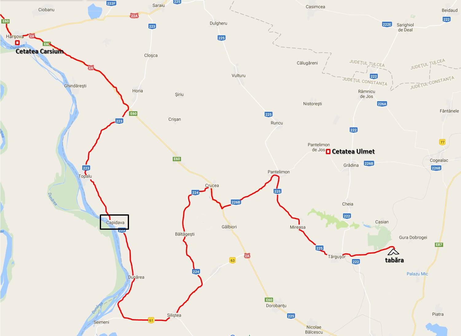 – de la Siliștea, după 6 km pe un drum de pământ cu pietriș (pregătit pentru asfaltare ?) – DC 61 -, ne racordăm la DJ 223, pe al cărui asfalt de nota 8 ajungem după 11 km la Capidava (de aici, după alți 16 km ai aceluiași DJ 223, ne vom reîntoarce pe DN 2A).