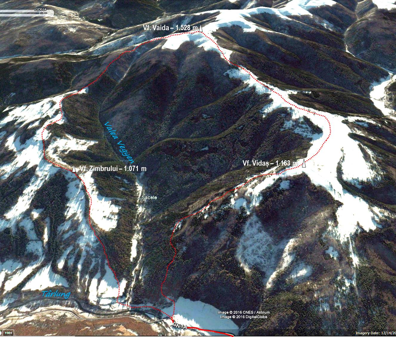 Traseu: Săcele (Coada Lacului Târlung/Gura Văii Vegyen) – Vf. Vidaș – Vf. Vaida – Vf. Zimbrului – Gura Văii Vegyen