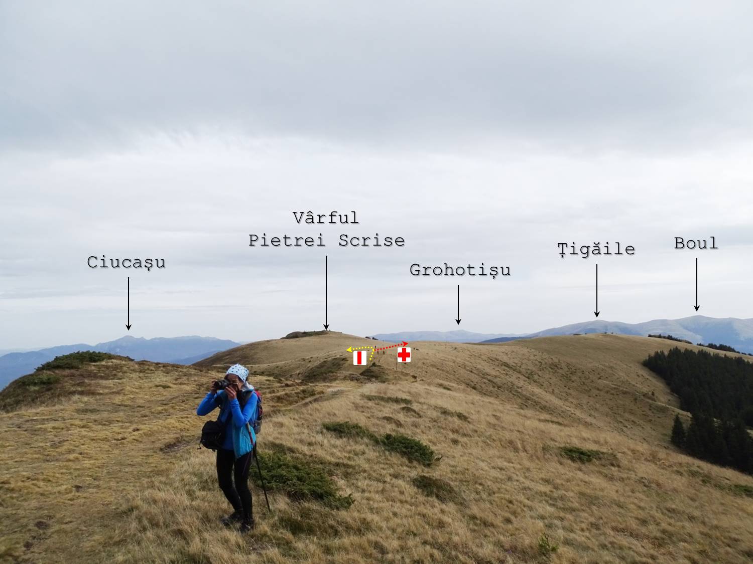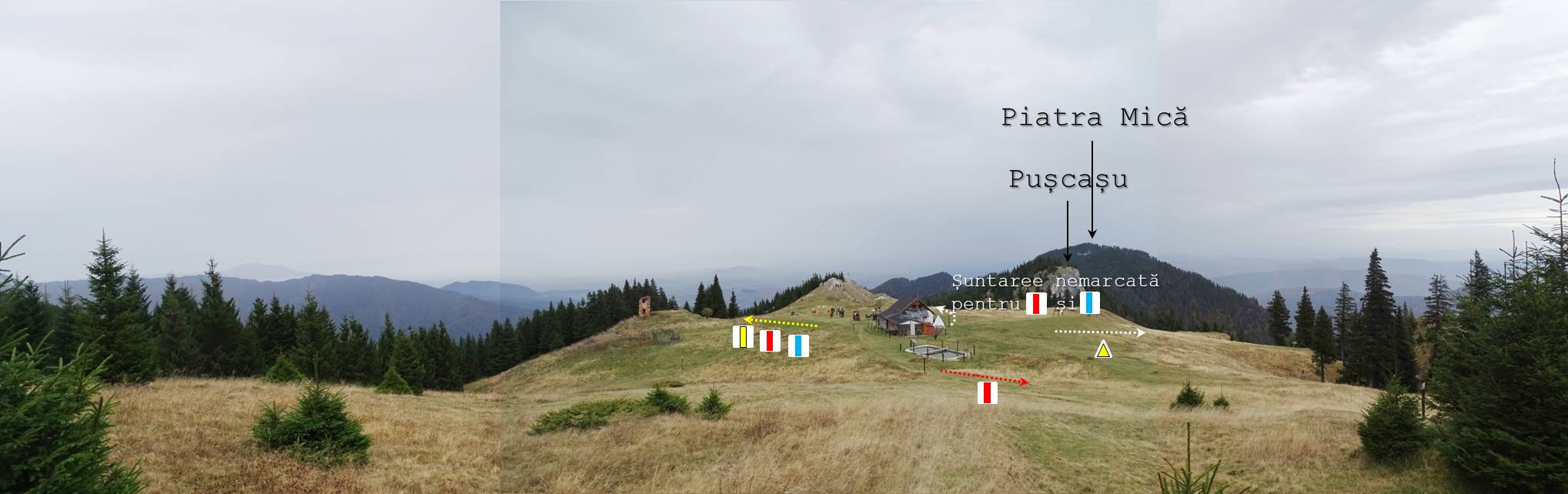 – marcajul cruce roșie pornește din “banda roșie” (ce duce la Vârful Piatra mare) din intersecția de deasupra Pietrei Scrise;