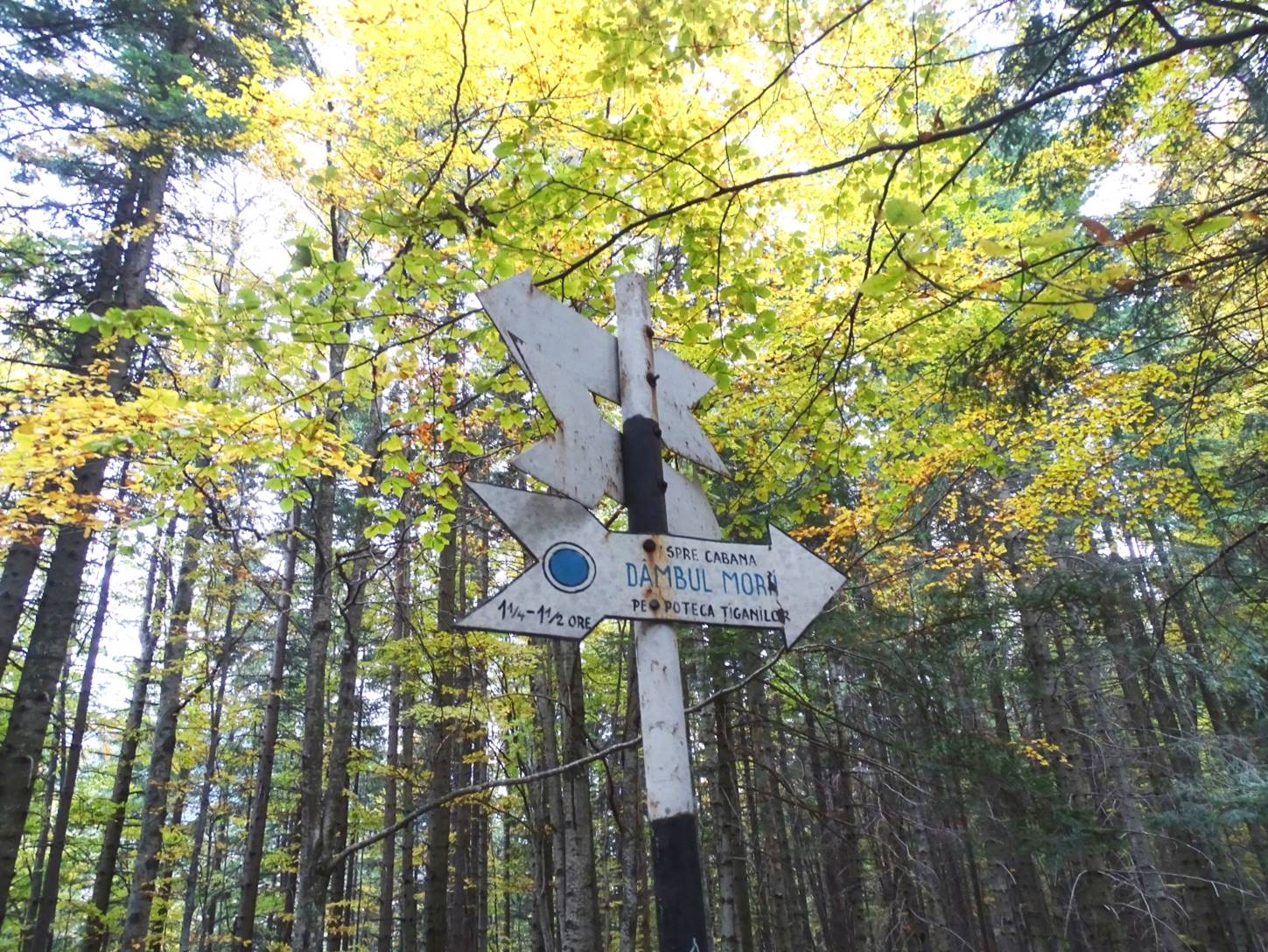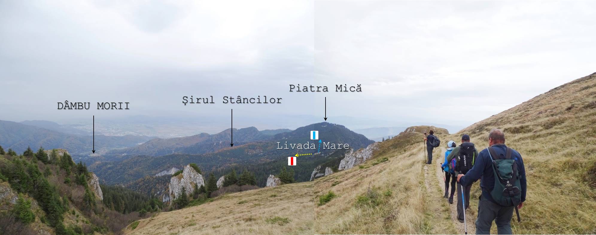 [16:30] De cum ajunge pe culmea interfluviului, spre care tot tindea de la intrarea în Livada Mare, întâlnim indicatorul ce ne arată direcția și marcajul – spre dreapta – potecii de legătură cu “punctul roșu” (care vine dinspre Piatra Mică pe Șirul Stâncilor). Spre stânga, poteca noastră, părăsind muchia culmii, coboară …