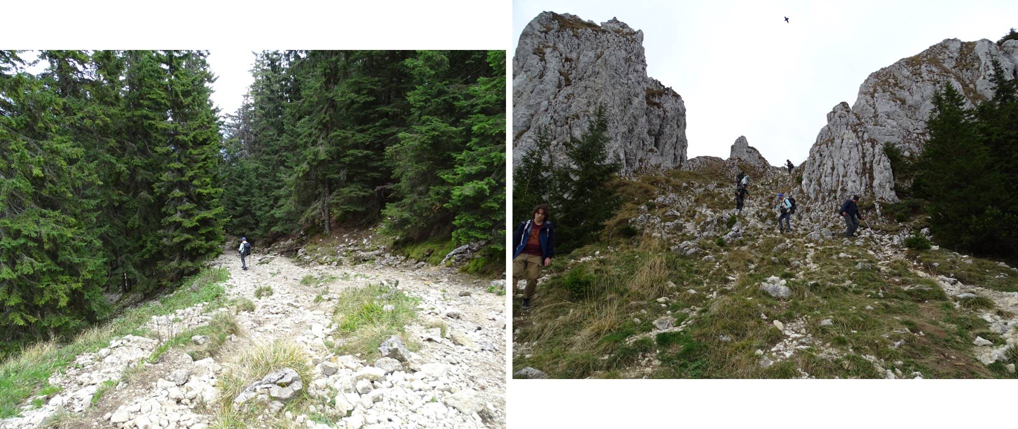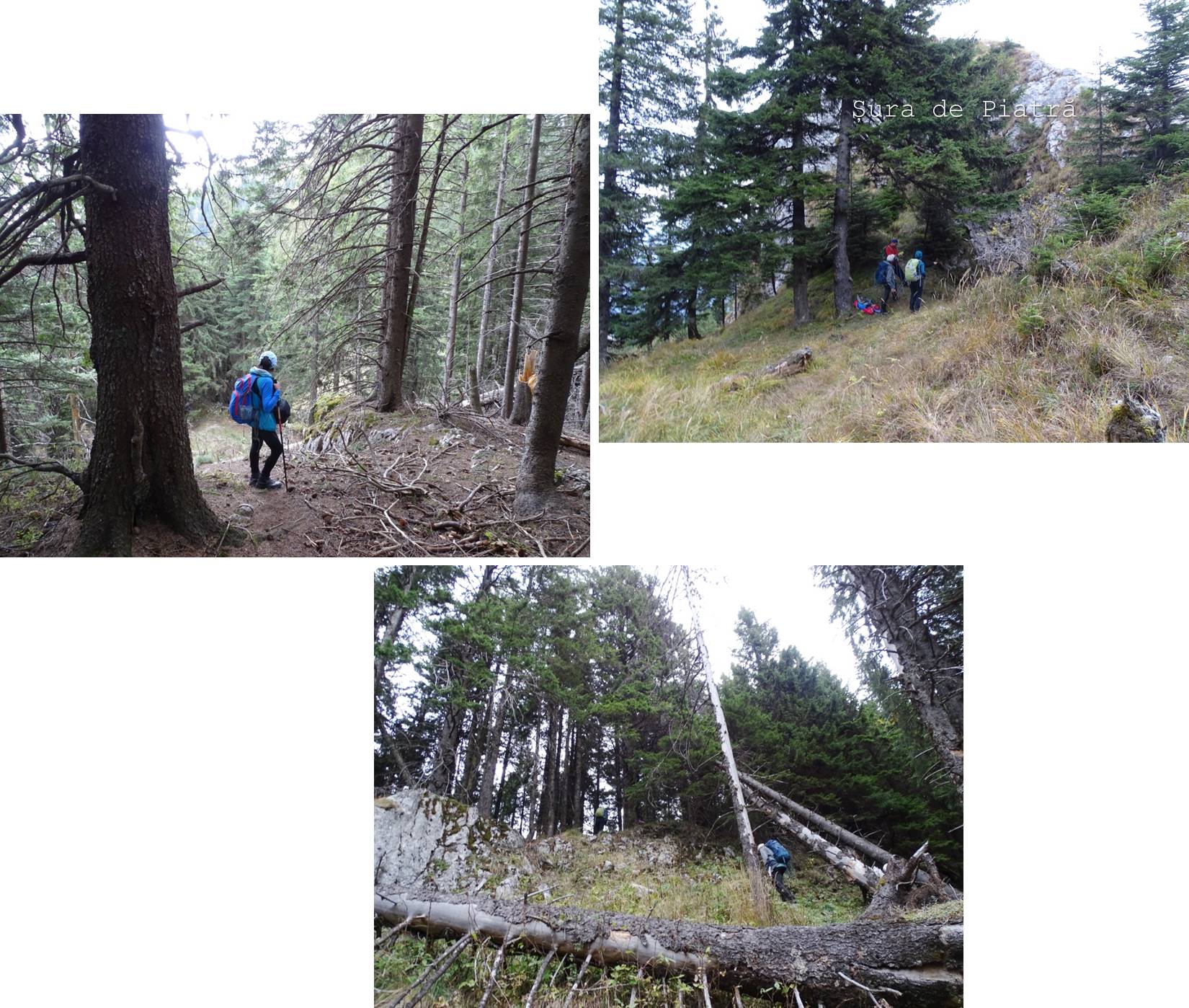 De aici, părăsim “banda roșie” și suim pieziș la culmea din stânga noastră, care ne duce, repede, la coada stâncăriei numite Șura de Piatră, …