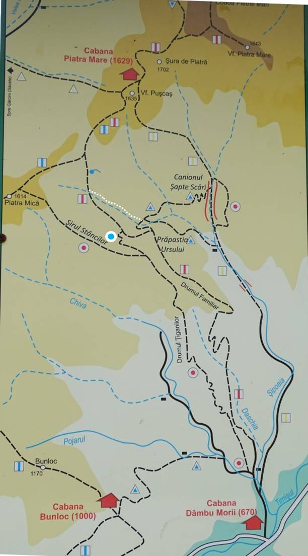 O schiță de hartă suplimentează informația necesară abordării traseelor … convenționale ce converg/diverg la/de la Cabana Piatra Mare (cărora noi le-am adăugat o potecă nemarcată ce coboară din capătul de jos al Livezii Mari la Prăpastia Urșilor).