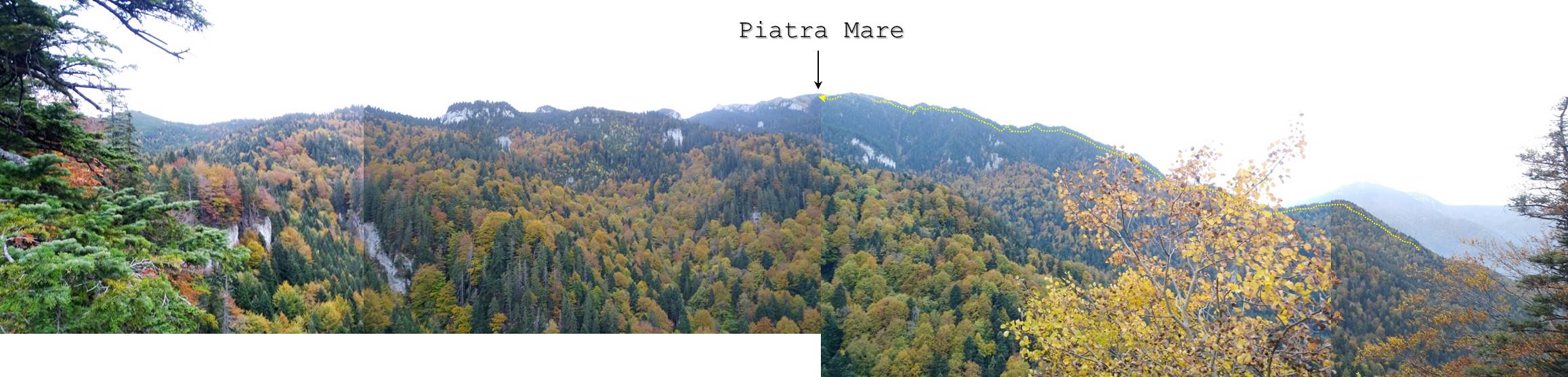 … la punctul de belvedere de deasupra Prăpastiei Urșilor, de unde avem prilejul de a contempla muchia Sihlei, cea pe care am urcat spre vârful Pietrei Mari ! Teoretic, de aici, de pe mica platformă cu belvedere, coboară în stânga, spre Păpastia Urșilor, o potecă nemarcată (pe care nu am abordat-o încă) !