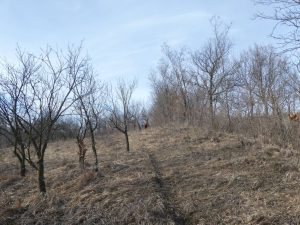 … întâi să străbatem o veche livadă de pruni, acum sălbăticită, ca apoi să continue de-a coasta tăind fânețe și alte livezi părăsite.