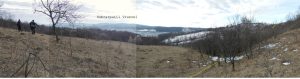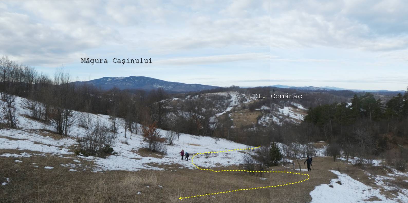 … din capătul ei sudic – de fapt, capătul estic al Poienii Comănac – schimbăm drastic direcția, luînd-o spre est, pa coama Dealului Comănac, …