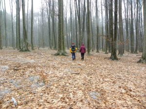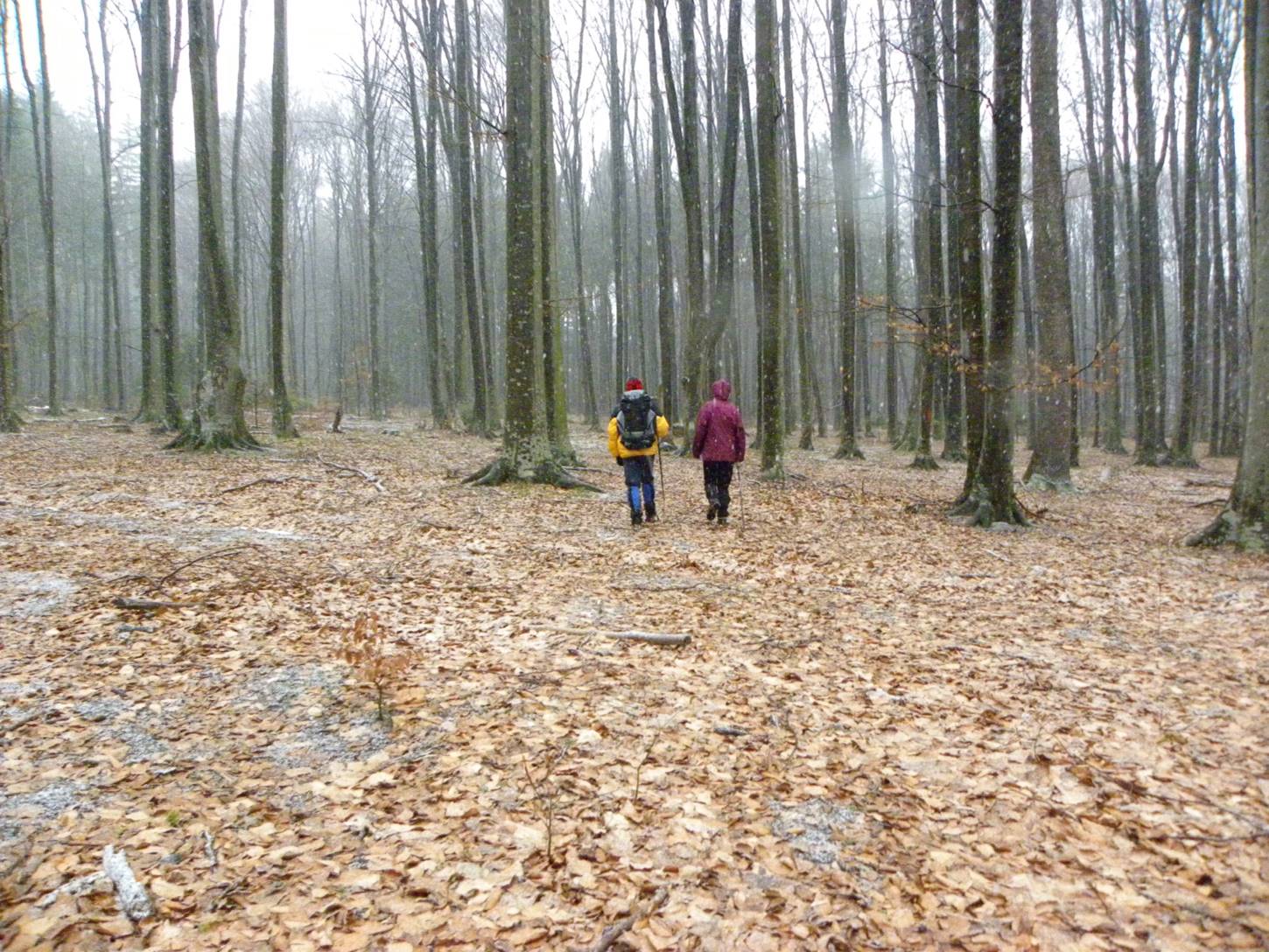 De cum ne întoarcem pe culme intrăm aproape imediat în pădure. Drumul e bun, dar nu e rău să reținem marcajul silvic “bandă roșie verticală” care ne ajută să ne menținem pe culme.