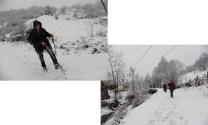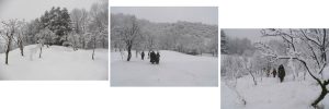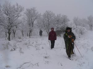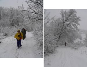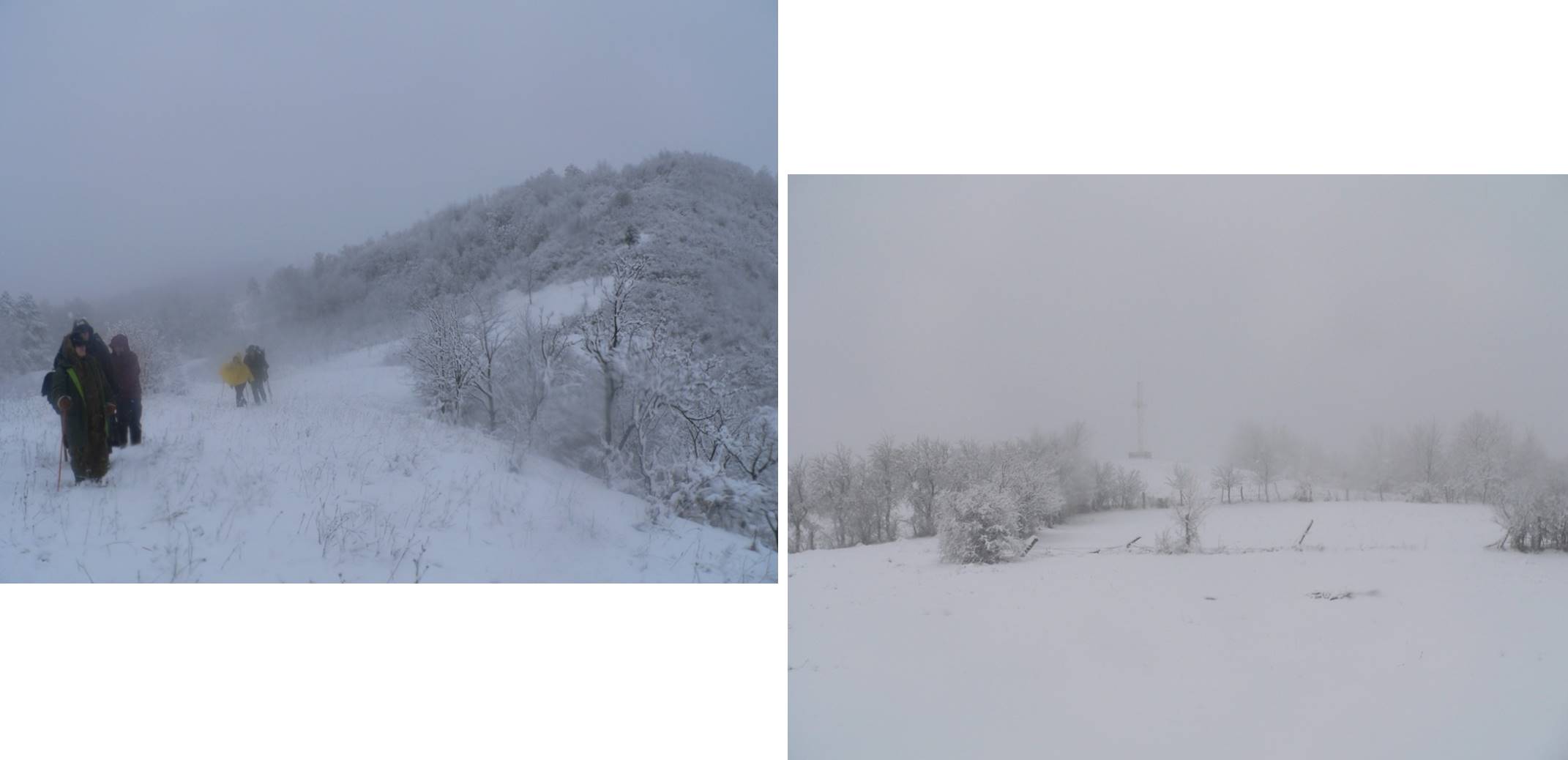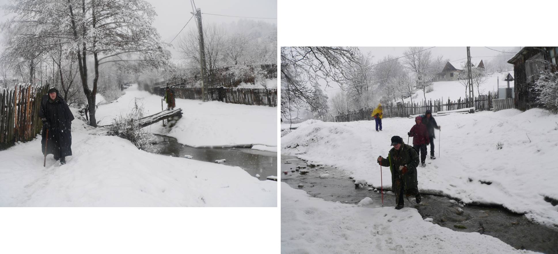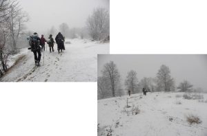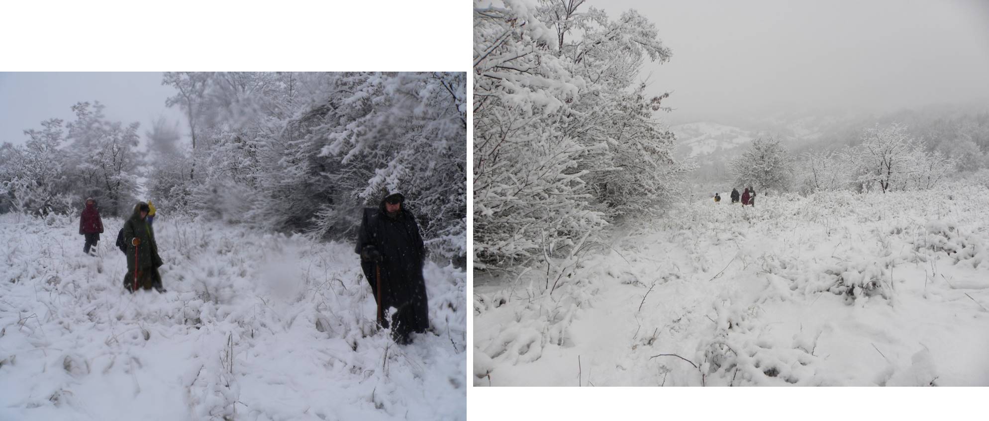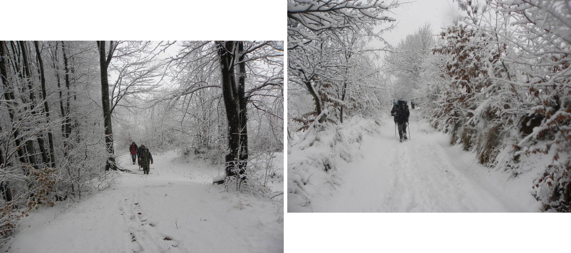 Când, după jumătate de oră de la … întoarcerea timonei, ieșim din pădure, iarna s-a instalat de-a binelea în Poiana Comănacului. Menționăm că în această ultimă parte a sa, parcursul prin pădure este ghidat de drumul foarte clar – datorită ultilizării sale și ca vechi drum pastoral și ca, mai nou, drum de exploatare forestieră, făcând trecerea din valea Curiței în valea Cașinului -, dar și de marcajul silvic “bandă roșie verticală”.