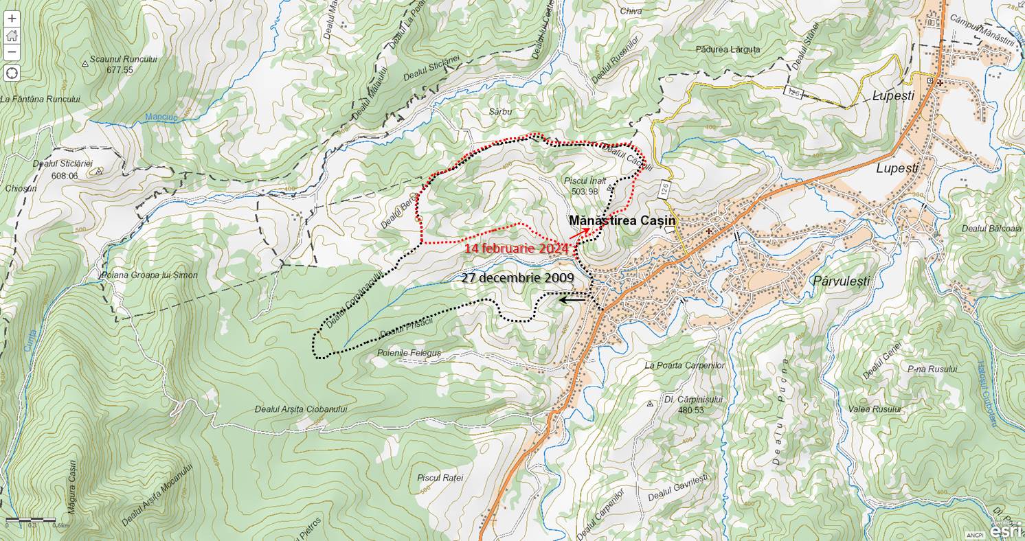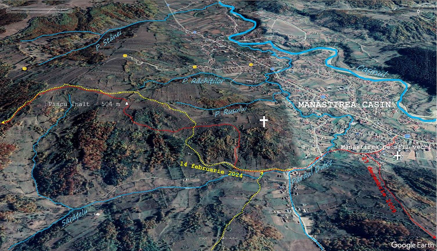 Cum în 2009 ulițele Mânăstirii Cașin încă nu prea erau asfaltate am ales ca punct de intrare în traseul per pedes capătul “aval” al străzii Eremia Grigorescu, cea din care, după 200 m, se desprinde derivația spre mânăstirea pe stil vechi. De aici mai mergem încă 100 m până la a doua uliță spre stânga, pe care vom sui … la deal ! Imediat se va bifurca, noi alegând brațul ei drept (deși nu are importanță) …