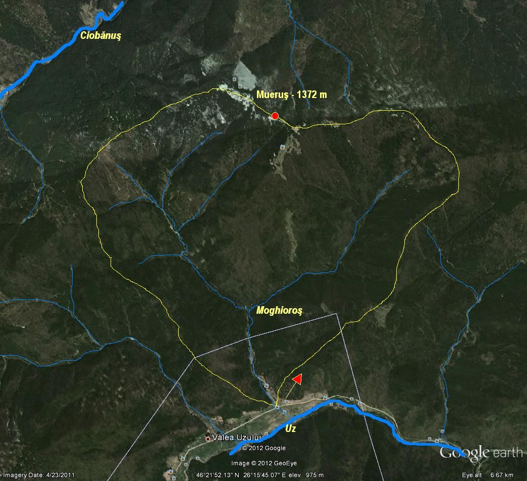 Traseu: Valea Uzului – Colţul Tablei – Plaiul Lapoşului – Culmea Dragotele – Mt. Mueruş – Mt. Piatra Şatrei – Mt. Glodului – Valea Uzului