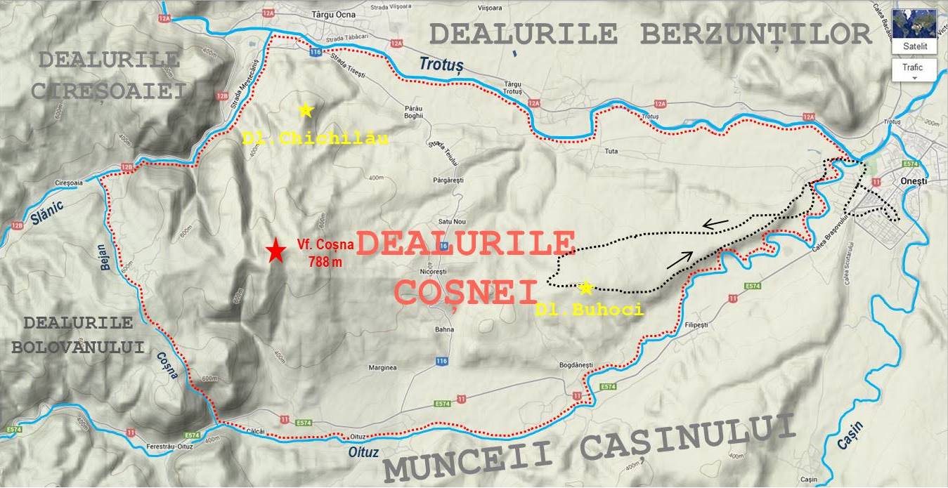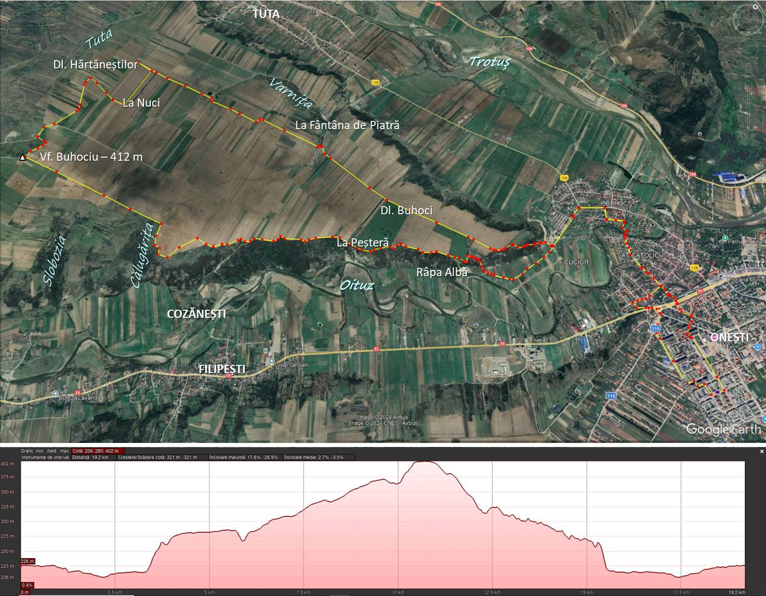 Traseu: ONEȘTI – Cartier Buhoci – Dl. Buhoci – La Fântâna de Piatră – la Nuci – Dl. Hărtăneștilor – Vf. Buhociu – Livada Călugăriței – La Peșteră – Râpa Albă – Cartier Buhoci – ONEȘTI