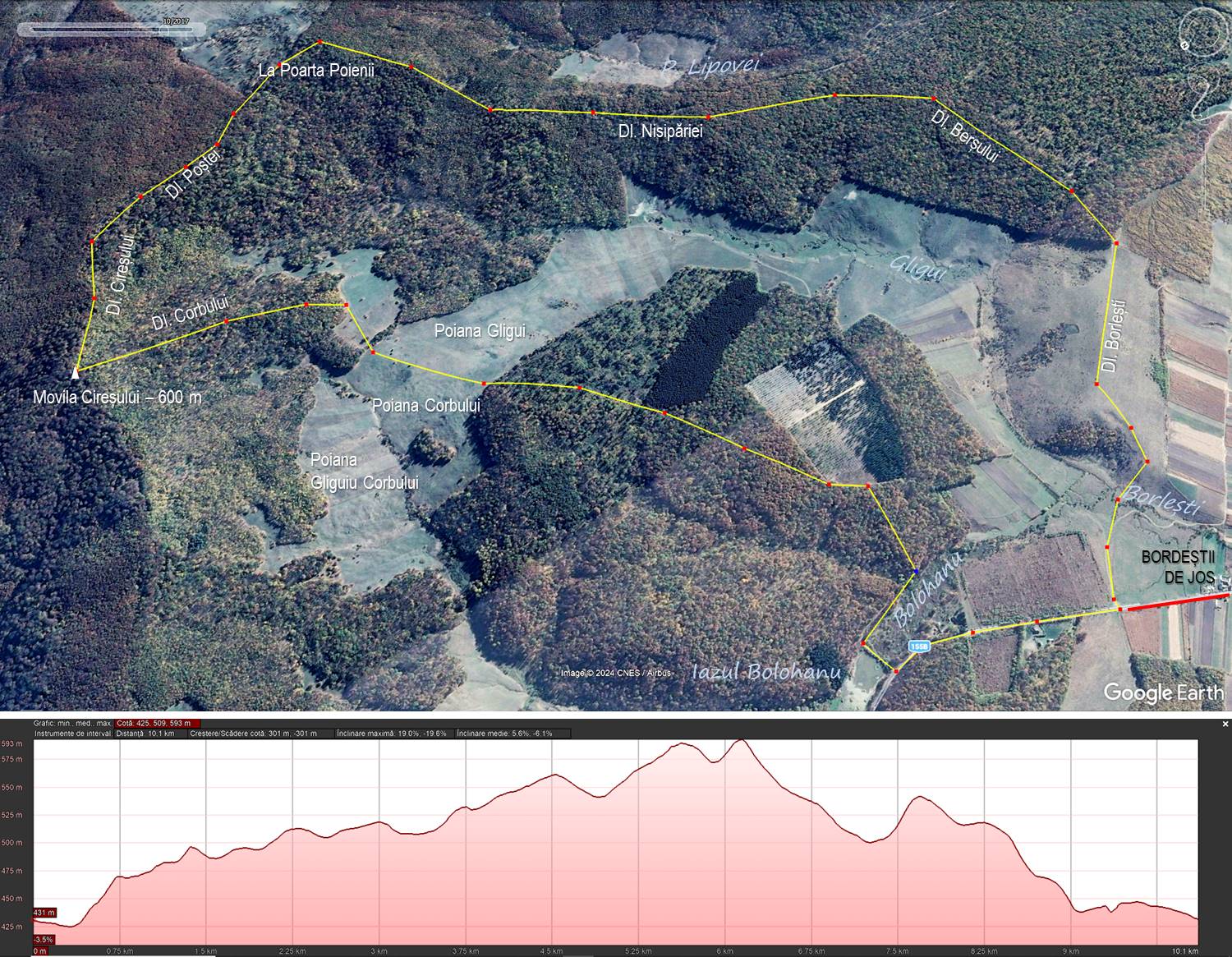 Traseu: BORDEȘTII DE JOS – Dl. Borlești – Dl. Berșului – Dl. Nisipăriei – Poarta Poienii – Movila Cireșului – Dl. Corbi – Iazul Bolohanu – BORDEȘTII DE JOS