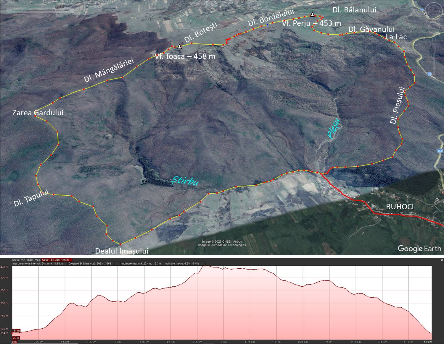 Traseu: BUHOCI (Gura Pleșului) – Valea Știrbu – Dl. Imașului – Dl. Țapului – Zarea Gardului – Dl. Măngălăriei – Vf. Toaca – Dl. Bordeiului – Vf. Perju – Dl. Găvanului – Dl. Pleșului – Gura Pleșului