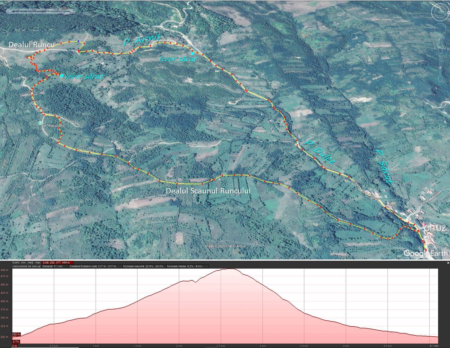 Traseu: OITUZ (Confluența P. Dulce-P. Sărat) – Dl. Scaunul Runcului – Dl. Runcu – P. Ariniș/P. Dulce – Confluența P. Dulce-P. Sărat
