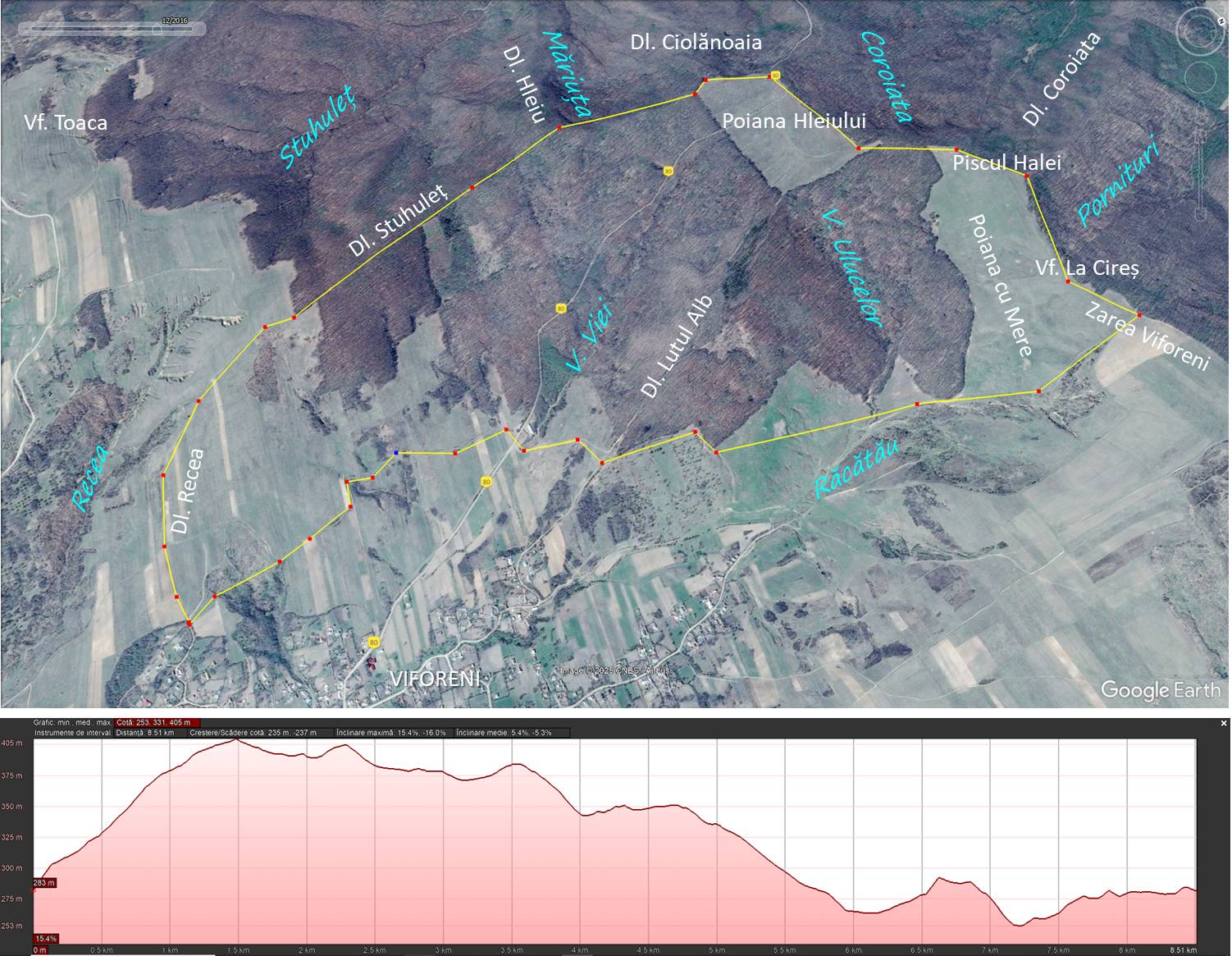 Traseu: VIFORENI – Dl. Recea – Dl. Stuhuleț – Poiana Hleiu – Poiana cu Mere (Piscu Halei – Vf. La Cireș) – Valea Răcătău Dl. Lutul Alb – Valea Viei – VIFORENI