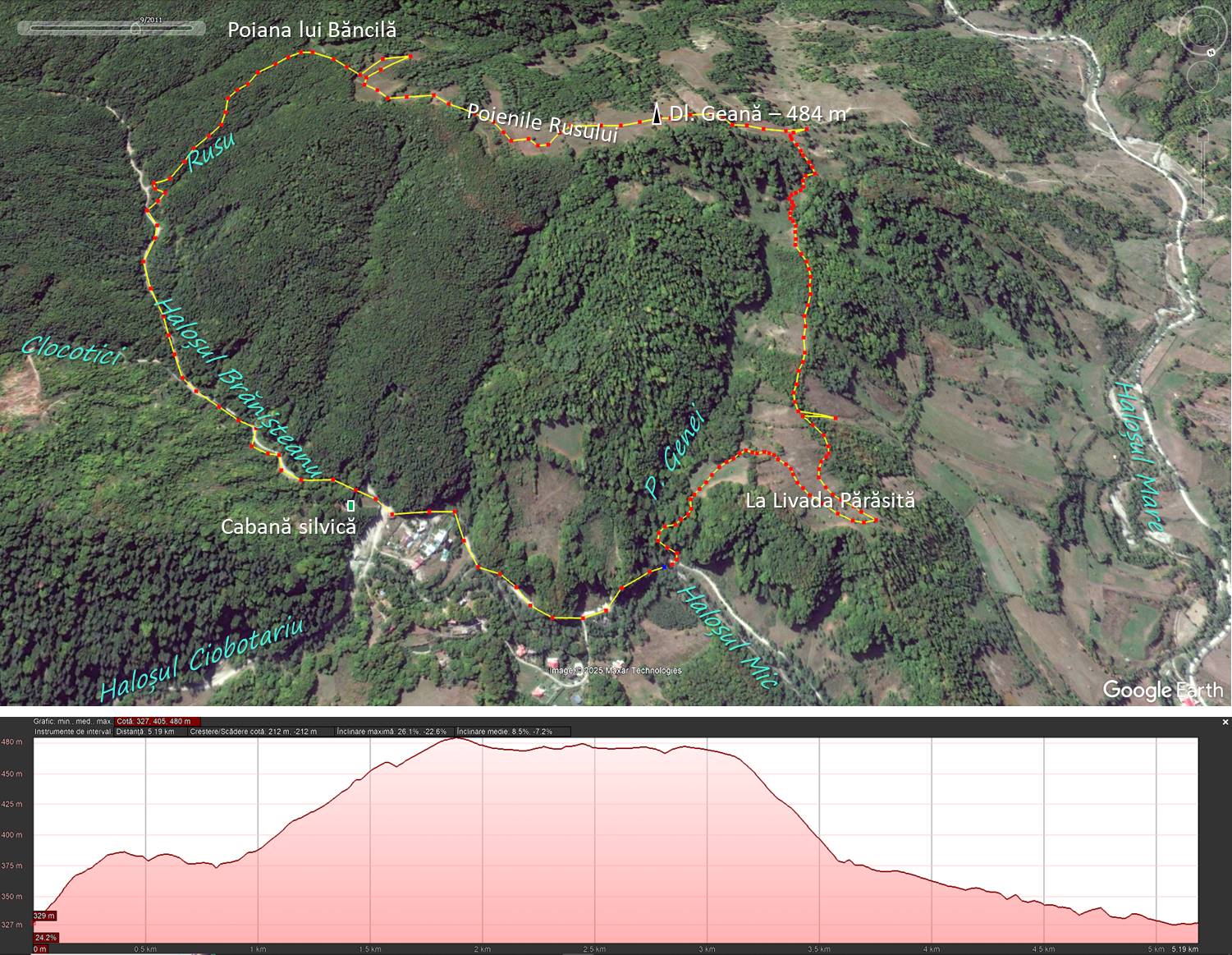 Traseu: Pârvulești (Confluența Haloșu Mic – P. Genei) – La Livada Părăsită – Dl. Geană – Poienile Rusului – Poiana lui Băncilă – Gura Rusului – Valea Haloșu Brănișteanu – Confluența Haloșu Mic – P. Genei
