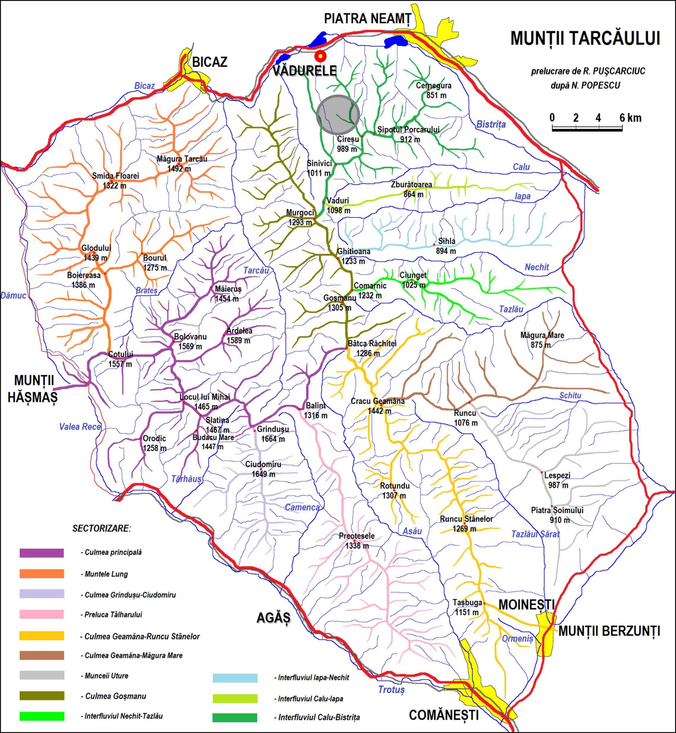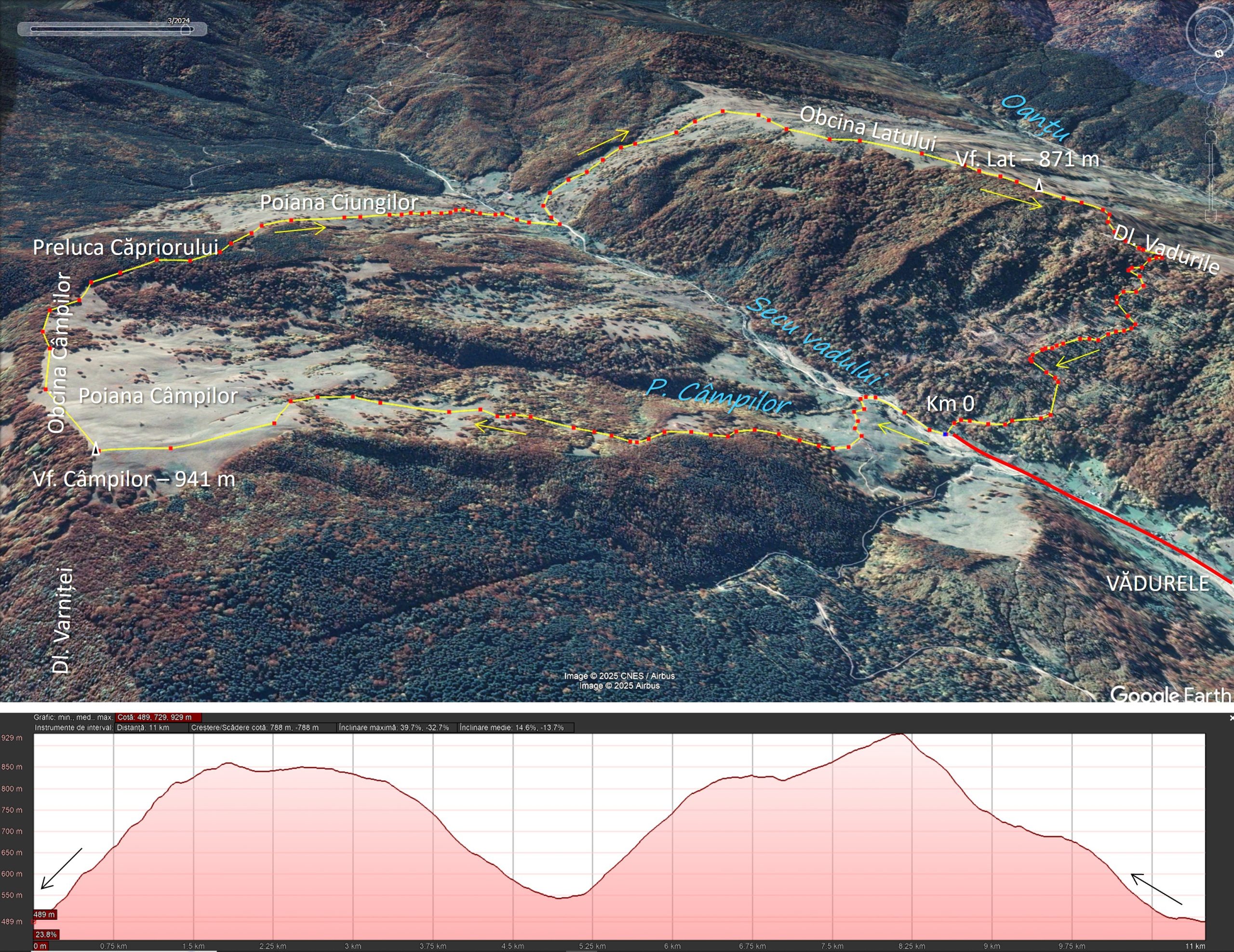 Traseu: Vădurele – Vf. Câmpilor – Obcina Câmpilor – Preluca Căpriorului – Poiana Ciungilor – Valea Secu – Obcina Latului – Vf. Lat – Dl. Vadurile – Vădurele