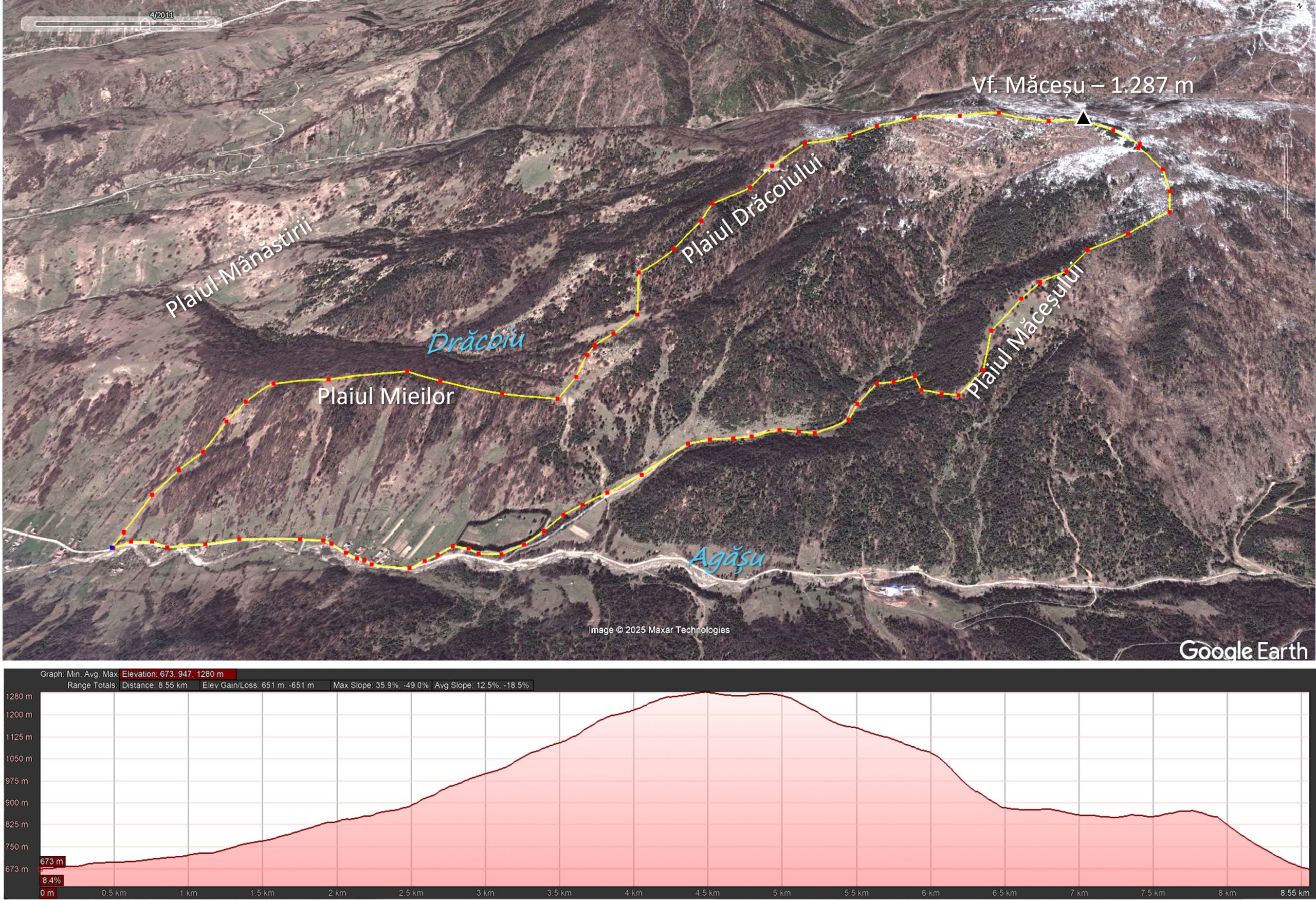 Traseu: Valea Agășului – Plaiul Măceșului – Vf. Măceșu – Plaiul Drăcoiului – Plaiul Mieilor – Valea Agășului
