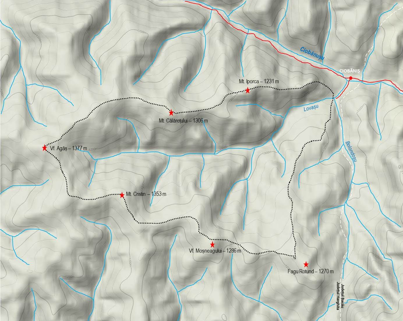 Traseu: Ciobăniș – Mt. Moșneagului – Mt. Cristin – Mt. Agăș – Mt. Călărețului – Ciobăniș