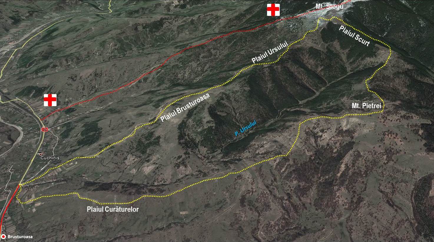 Traseu: Gura Ursului (Pârâul Ursului/Brusturoasa/BC) – Plaiul Curăturilor – Mt. Pietrei – Plaiul Scurt – Mt. Stogu – Plaiul Ursului – Plaiul Brusturoasa – Gura Ursului