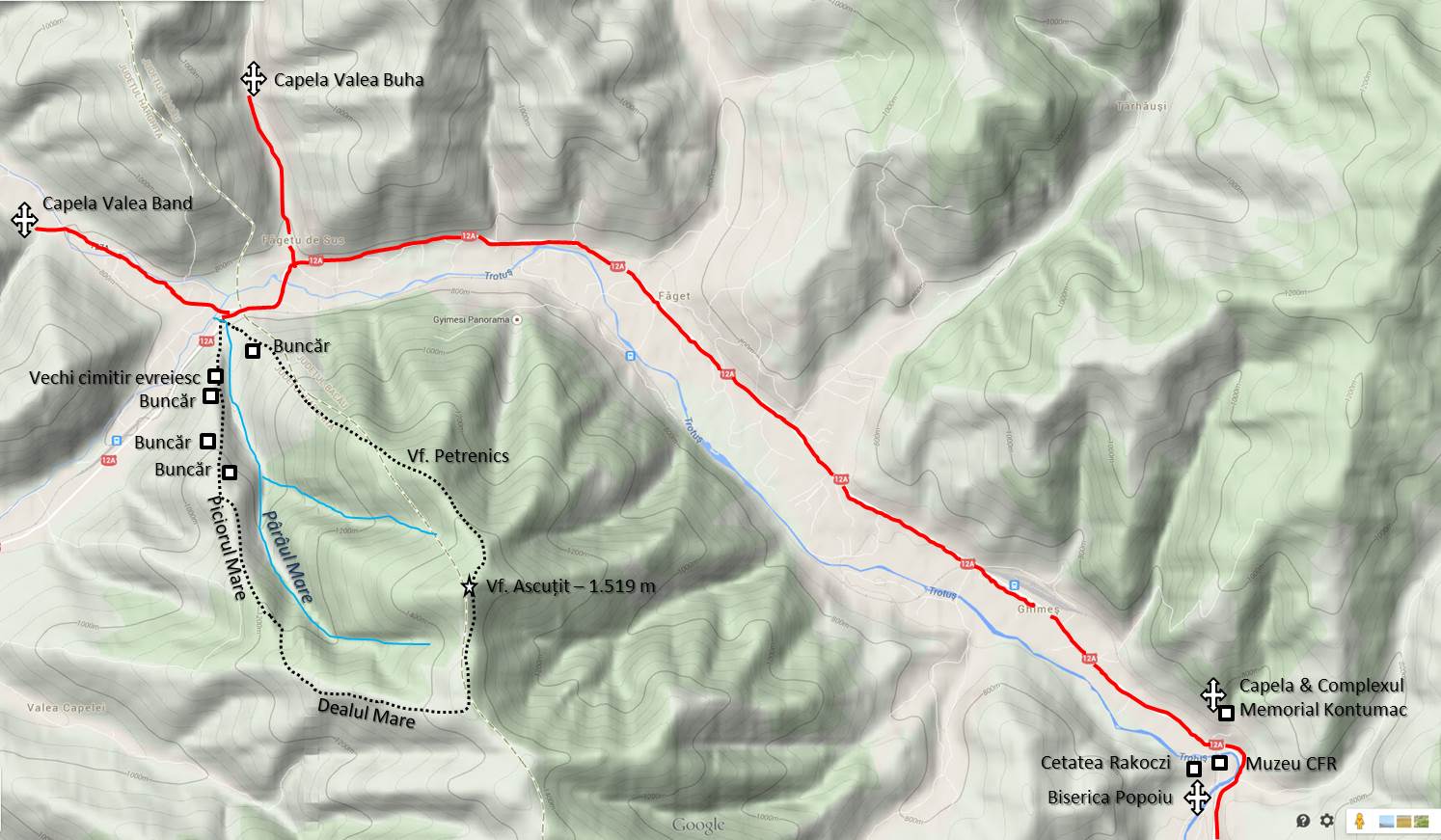 Traseu: Lunca de Jos [Capela Valea Buha, capela Valea Band] – Gura Văii Reci – Piciorul Mare (vechiul cimitir evreiesc, cazemate) – Dl. Mare – Vf. Ascuțit – Mt. Petrenics (cazemată) – Gura Văii Reci – Ghimeș [Cetatea Rakoczi, Capela & Complexul Memorial Kontumac]