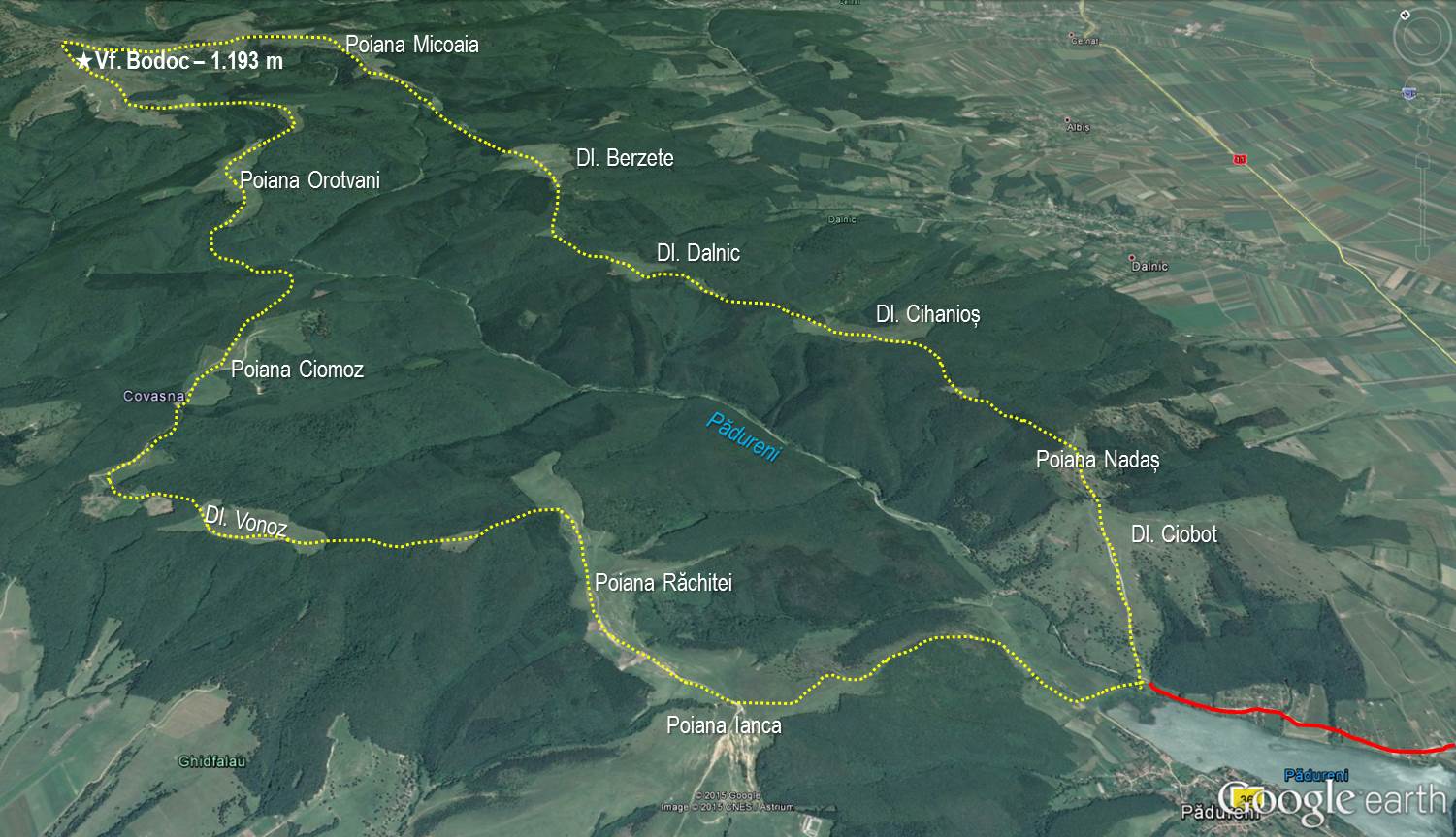 Traseu: Coada Lacului Pădureni – Poiana Ianca – Poiana Răchitei – Dl. Vonz – Poiana Ciomoz – Poiana Orotvani – Vf. Bodoc – Poiana Micoaia – Dl. Berzete – Dl. Dalnic – Dl. Cihanioș – Poiana Nadaș – Dl. Ciobot – Coada Lacului Pădureni
