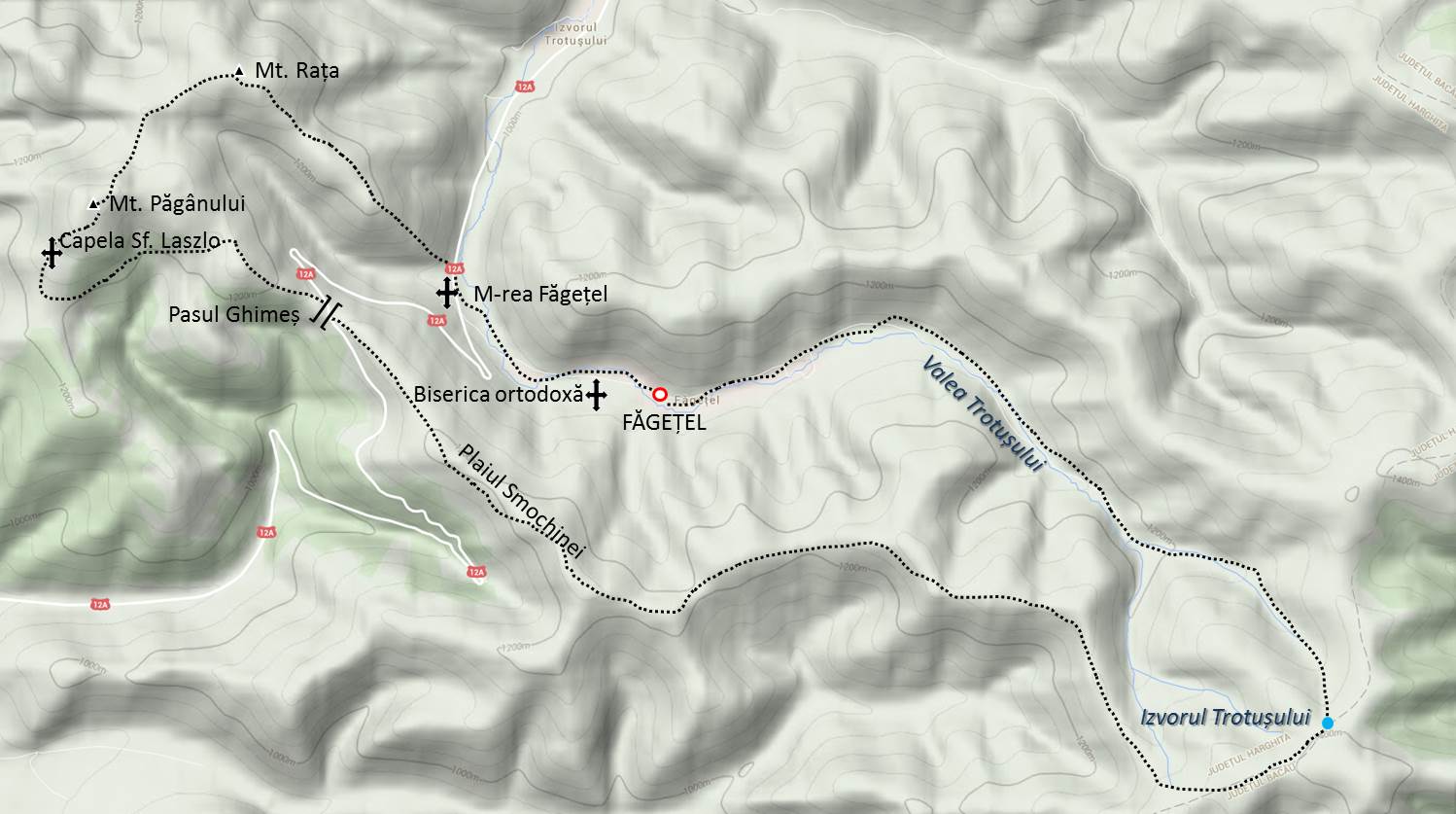 Traseu: M-rea Făgețel – Valea Trotușului – Izvorul Trotușului – Plaiul Smochinei – Pasul Ghimeș – Capela Laszlo – Vârful Păgânul – Vf. Rața – M-rea Făgețel