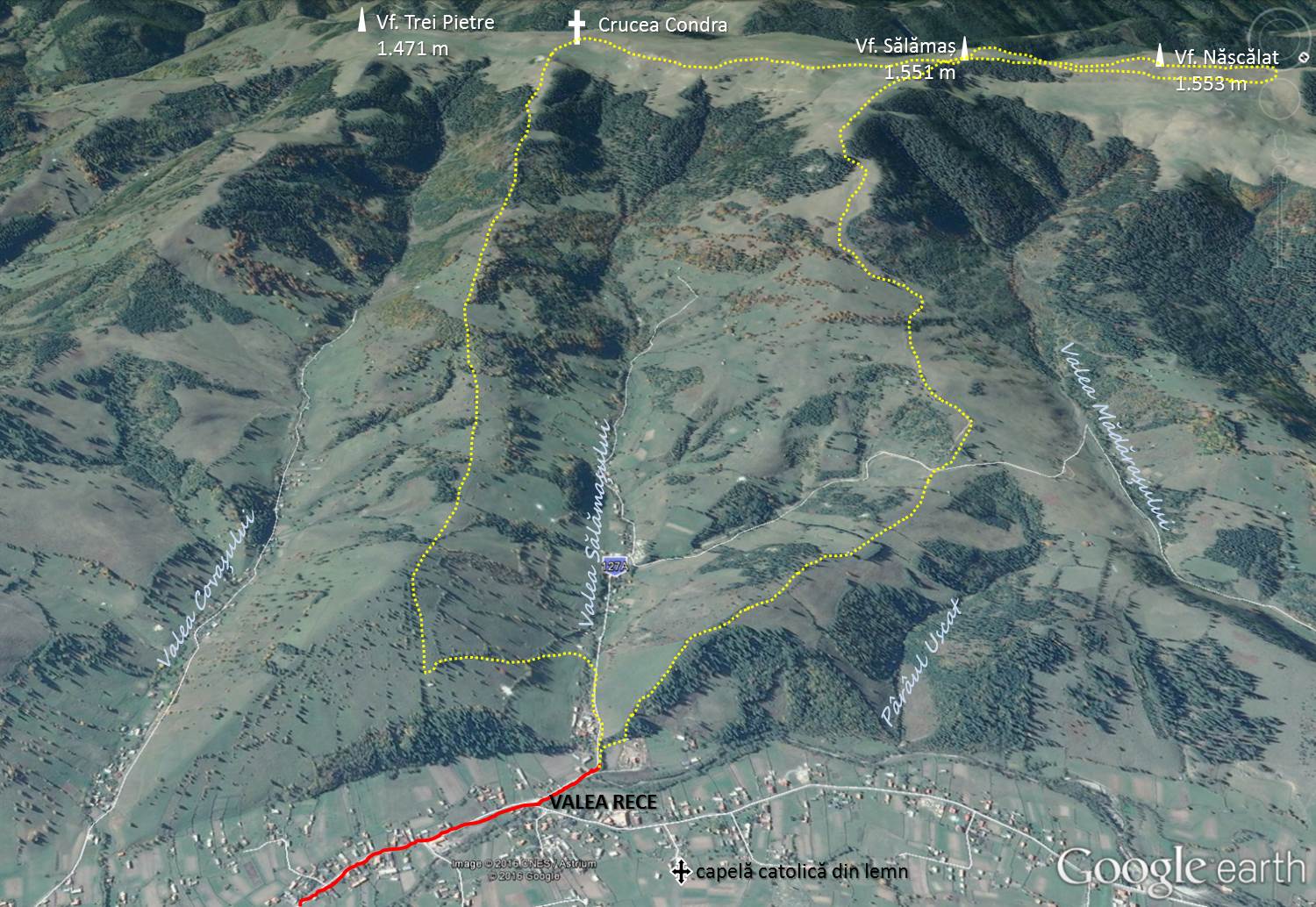 Traseu: Valea Rece (gura Salamasului) – Piciorul Salamas – Vf. Salamas – Vf. Nascalat – Vf. Salamas – Crucea Condra – Interfluviul Salamas-Covas – gura Salamasului