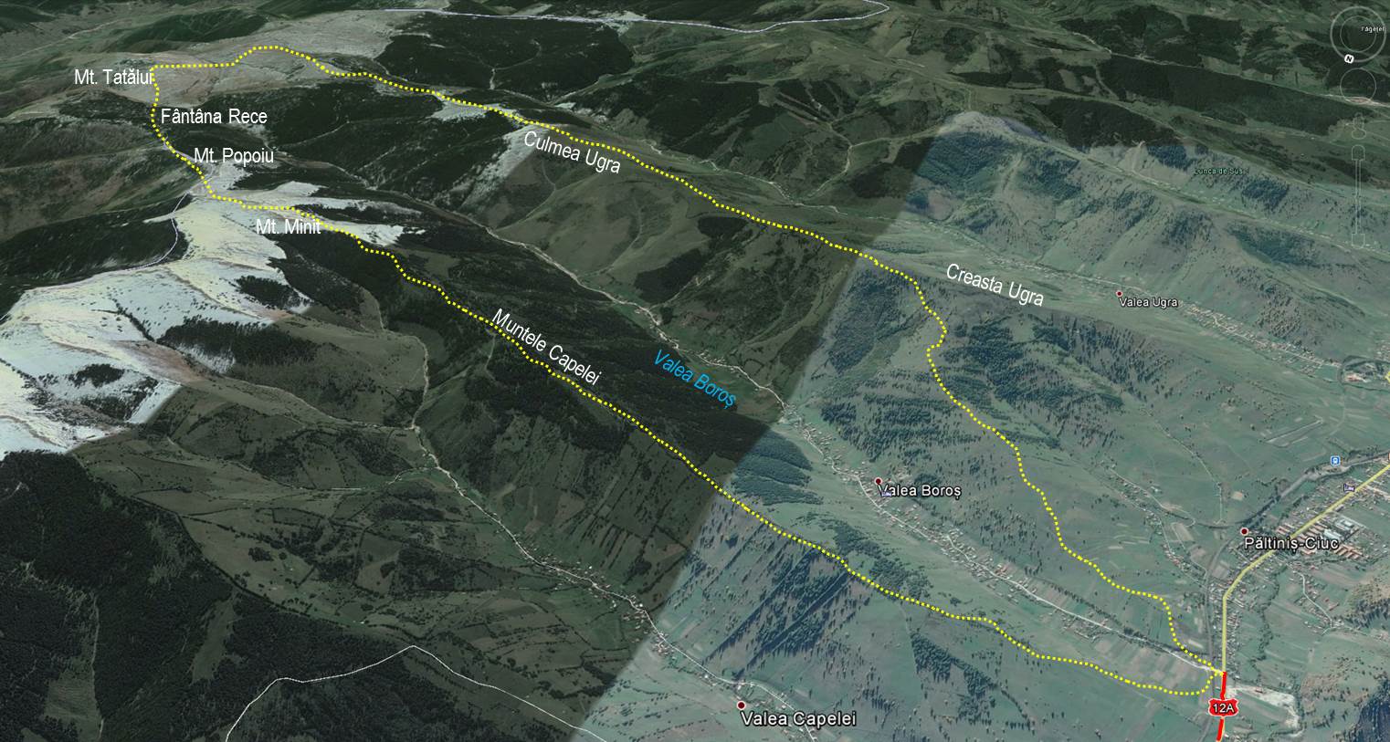 Traseu: Valea Boroș – Culmea Ugra – Mt. Tatălui – Fântâna Rece – Mt. Popoiu – Mt. Minit – Mt. Capelei Valea Boroș