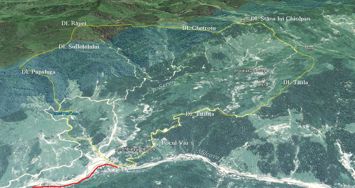 Traseu: [M-rea Mera – Rezervația Reghiu-Scruntaru – Poarta Dracilor & Cascada Crețului -] Andreiașu de Jos – Focul Viu – Dl. Titila – Dl. Stâna lui Ciolpan – Dl. Chetroiu – Dl. Râpei – Dl. Suflețel – Dl. Papaluga – Fostul Lac Papaluga – Andreiașu de Jos