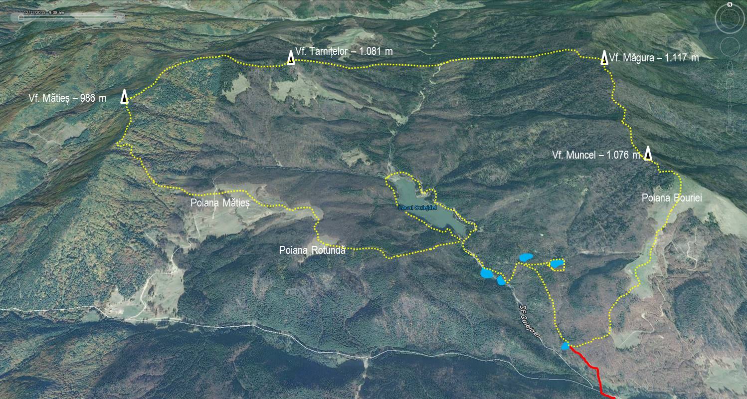 Traseu: Gura Cuejdelului – Lacurile mici – Turul Lacului Cuejdel – Poiana Rotundă – Vf. Mătieș – Vf. Tarnițelor – Vf. Măgurii – Vf. Muncel – Poiana Bouriei – Gura Cuejdelului