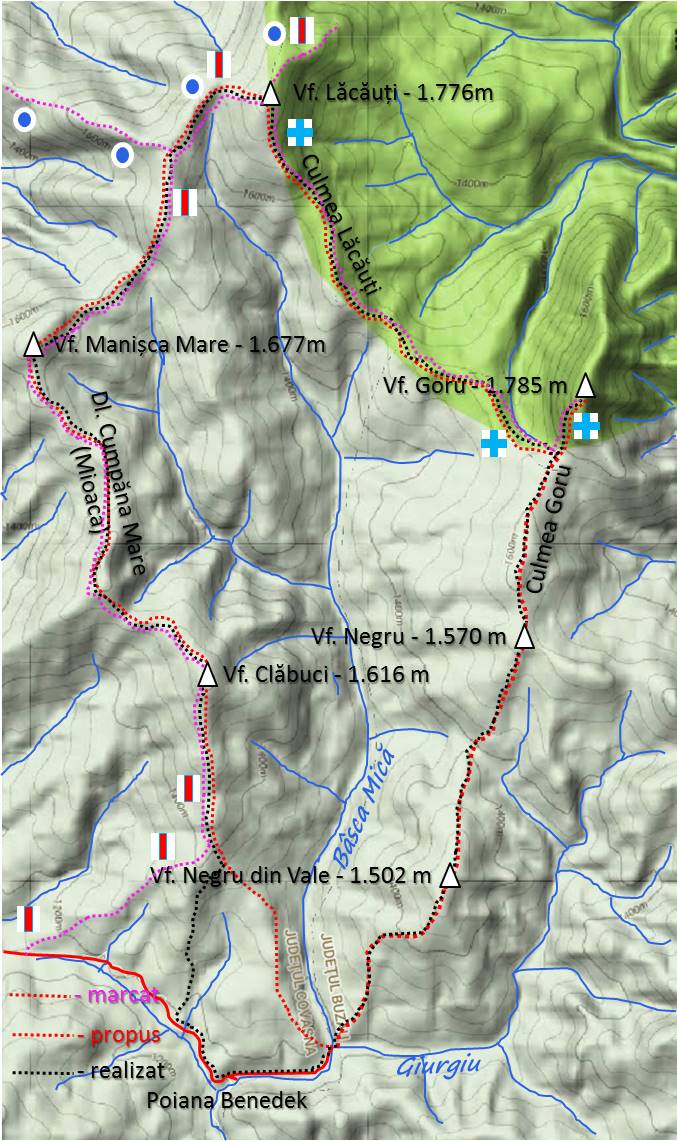 Traseu: Comandău (Poiana Benedek/Gura Giurgiului) – Vf. Negru din Vale – Vf. Negru – Plaiul Gorului – Vf. Goru – Plaiul Lăcăuți – Vf. Lăcăuți – Vf. Manișca Mare – Dl. Mioaca – Vf. Clăbuci – Gura Giurgiului
