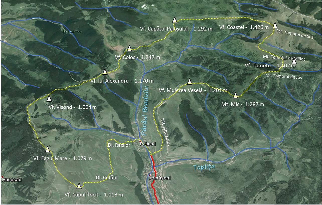 Traseu: Armășeni – Mt. Altarului – Mt. Mic – Mt. Tomotu – Mt. Colosu – Vf. lui Alexandru – Vf. Fagul Mare – Dl. Racului – Armășeni