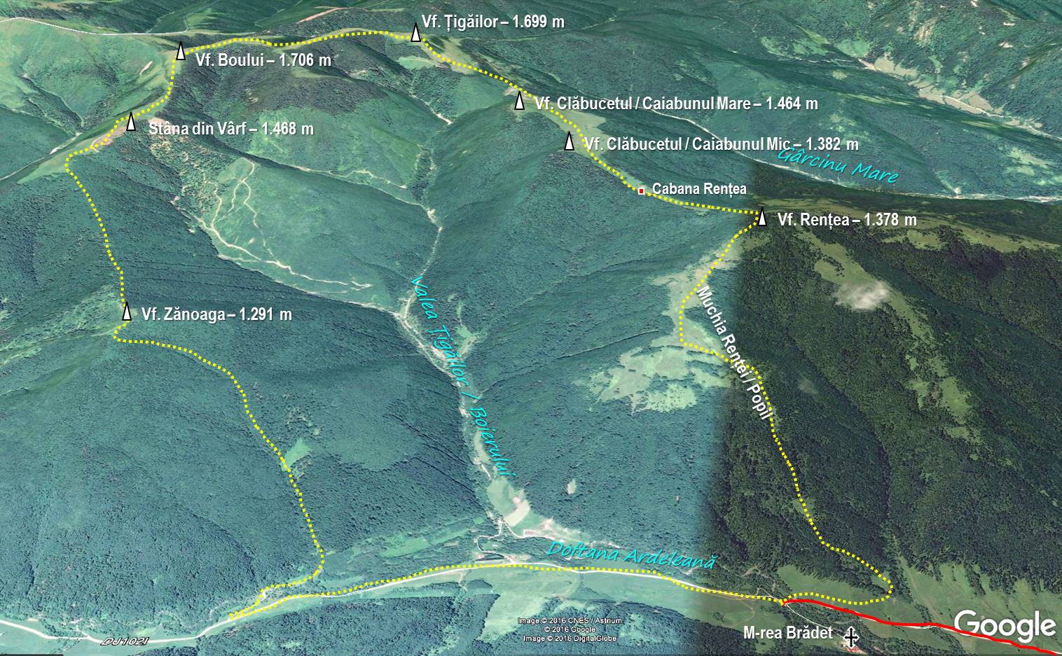 Traseu: M-rea Brădet – Valea Doftanei Ardelene – Vf. Zănoaga – Stâna din Vârf – Vf. Boului – Vf. Țigăilor – Vf. Clăbucetul Mare – Vf. Clăbucetul Mic – Vf. Rențea – Muchia Renței – M-rea Brădet