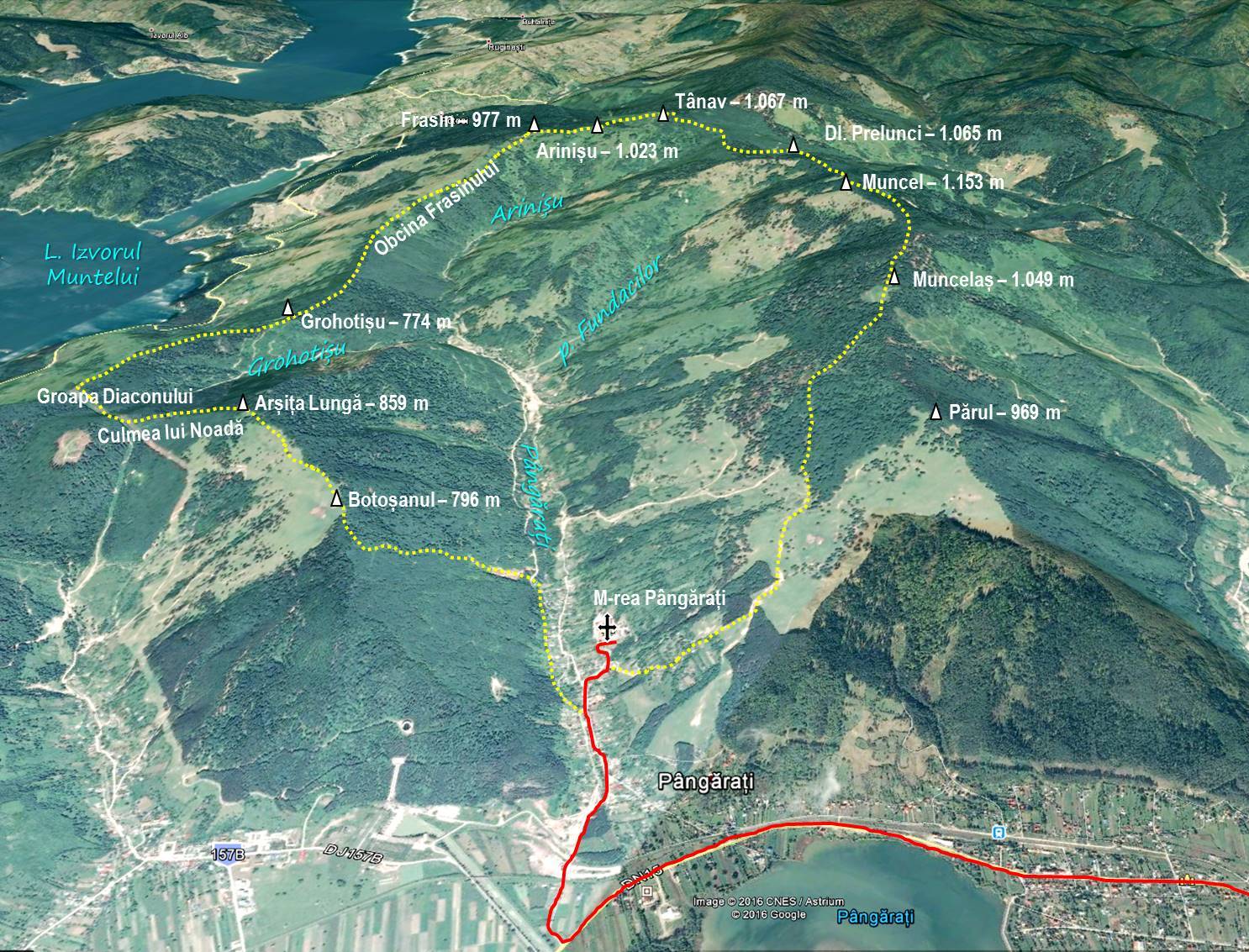Traseu: M-rea Pângărați – Dl. Părului – Muncelașu – Muncelu Pângăraților – Dl. Prelunci – Dl. Tânav – Dl. Ariniș – Dl. Frasin – Dl. Grohotiș – Poiana Fundu Diaconului – Culmea lui Noadă – Dl. Arșița Lungă – Dl. Botoșanu – M-rea Pângărați