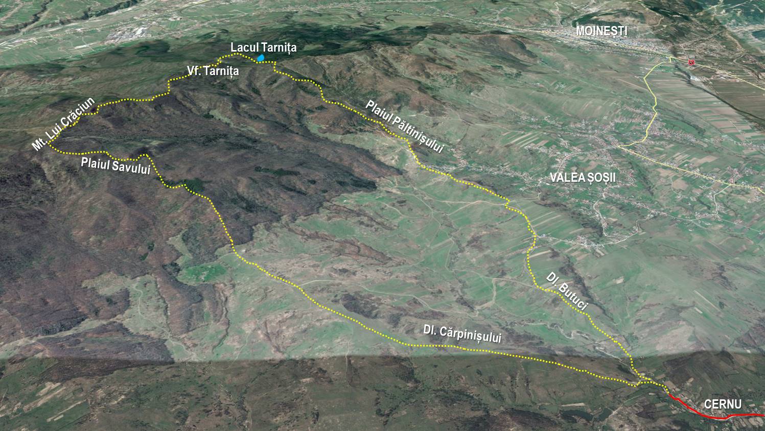 Traseu: Cernu (gura Păltinișului) – Dl. Cărpiniș – Plaiul Savului – Mt. lui Crăciun – Vf. Tarnița – Lacul Tarnița – Plaiul Păltiniș – Dl. Butuci – gura Păltinișului