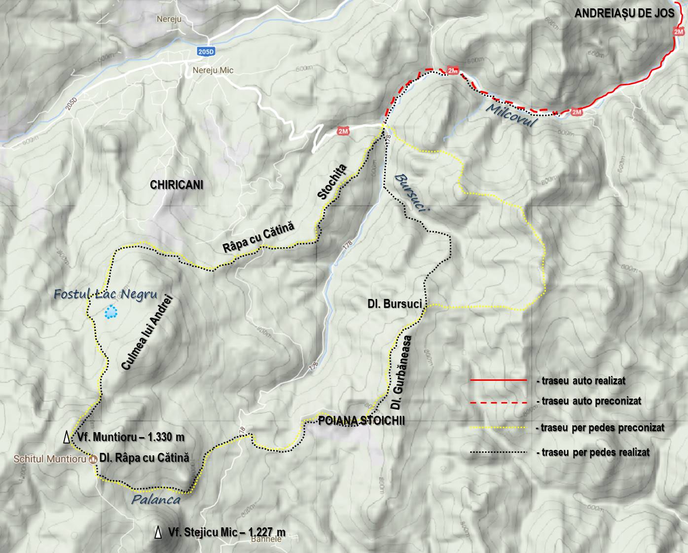 Traseu: Andreiașu de Sus (Răchitașu) – Valea Milcovului – Dl. Stochiței – Dl. Râpa cu Corni – Dl. Negru – Lacul Negru – Vf. Muntioru – Schitul Muntioru – Dl. Râpa cu Cătină – sat Poiana Stochița – Dl. Gurbănesei – Dl. Bursuci – Valea Bursuci – Valea Milcovului