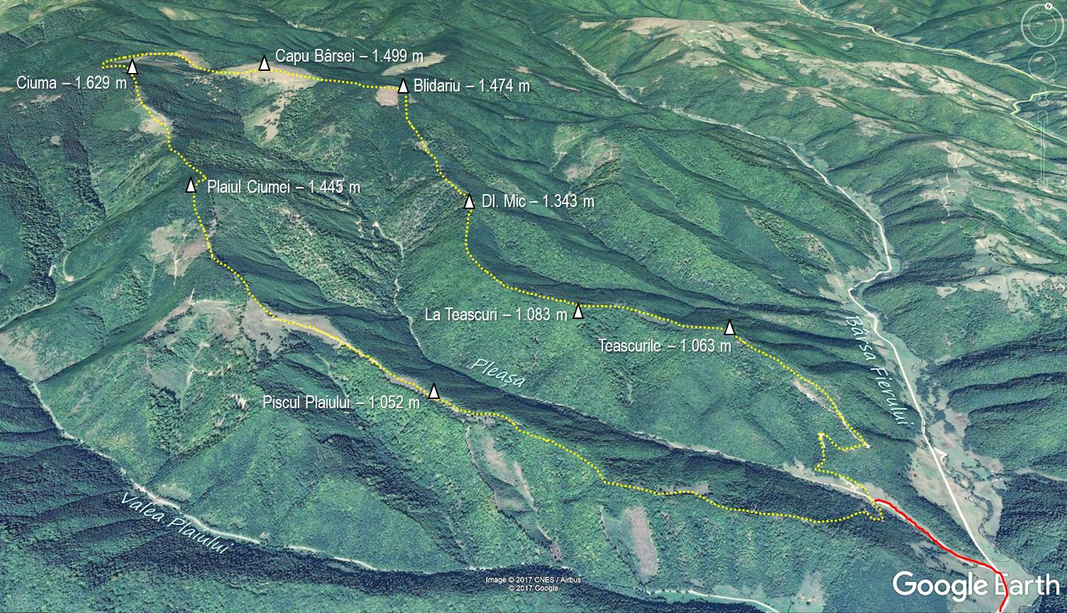 Traseu: Gura Văii Pleșii – Mt. Teascuri – Mt. Capu Bârsei – Vf. Ciuma – Plaiul Ciumei – Piscu Plaiului – Mt. Plaiul – gura Văii Pleșii