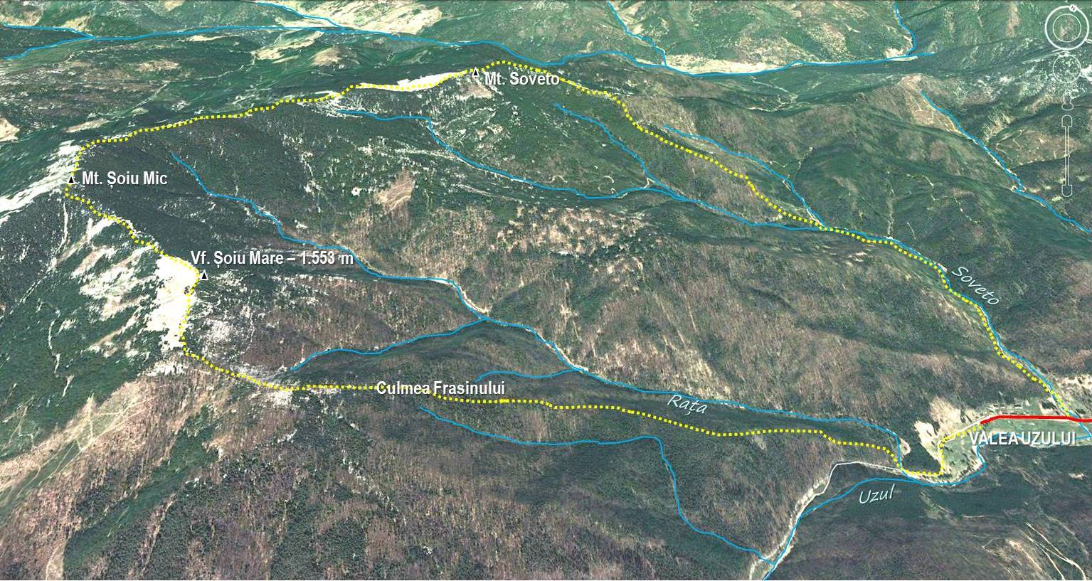 Traseu: Valea Uzului – Gura Raței – Culmea Frasinului – Mt. Șoiu Mare – Mt. Șoiu Mic – Mt. Soveto – Valea Soveto – Valea Uzului