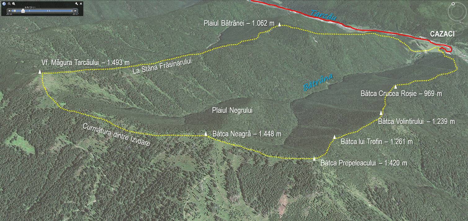 Traseu: Cazaci – Măgura Bătrânei – La Stâna Frăsinarului – Vf. Măgura Tarcăului – Bâtca Neagră – Bâtca Prepeleacului – Bâtca Volintirului – Bâtca Crucea Roșie – Cazaci