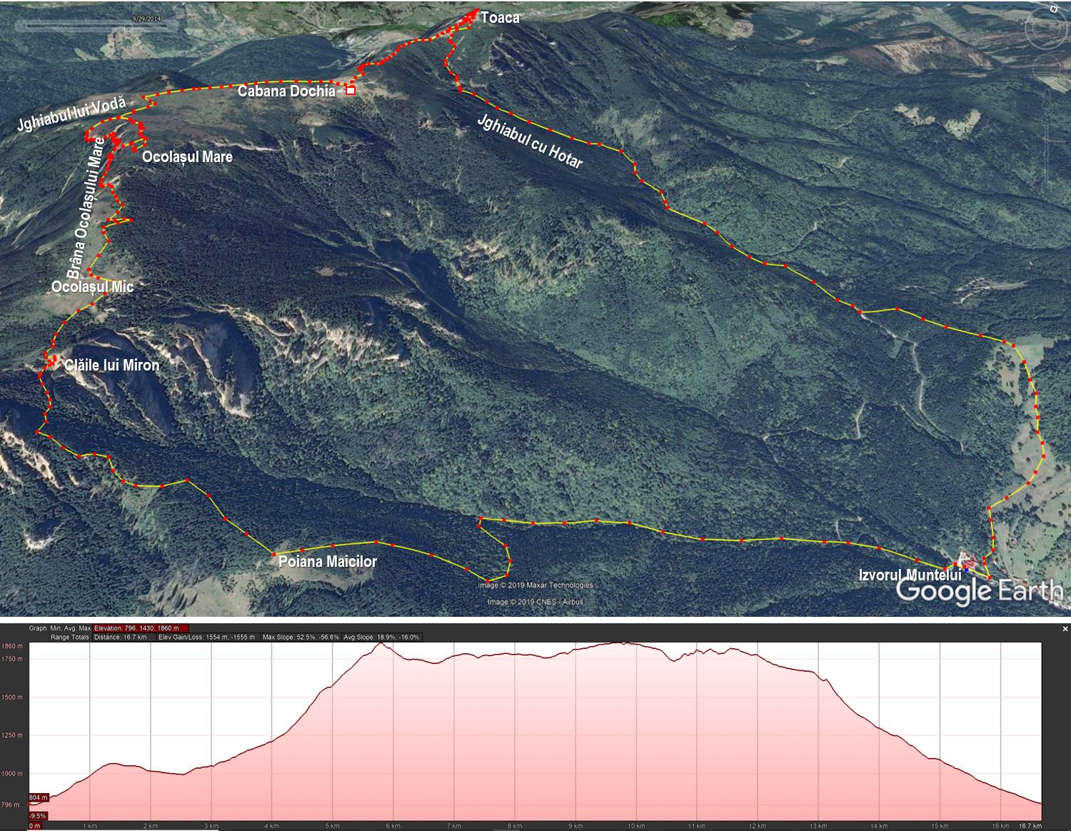 Traseu: Izvorul Muntelui – Jgheabul cu Hotar – Vf. Toaca – Cabana Dochia – Ocolașul Mare – Brâna Ocolașului Mare – Ocolașul Mic – Clăile lui Miron – Poiana Maicilor – Izvorul Muntelui